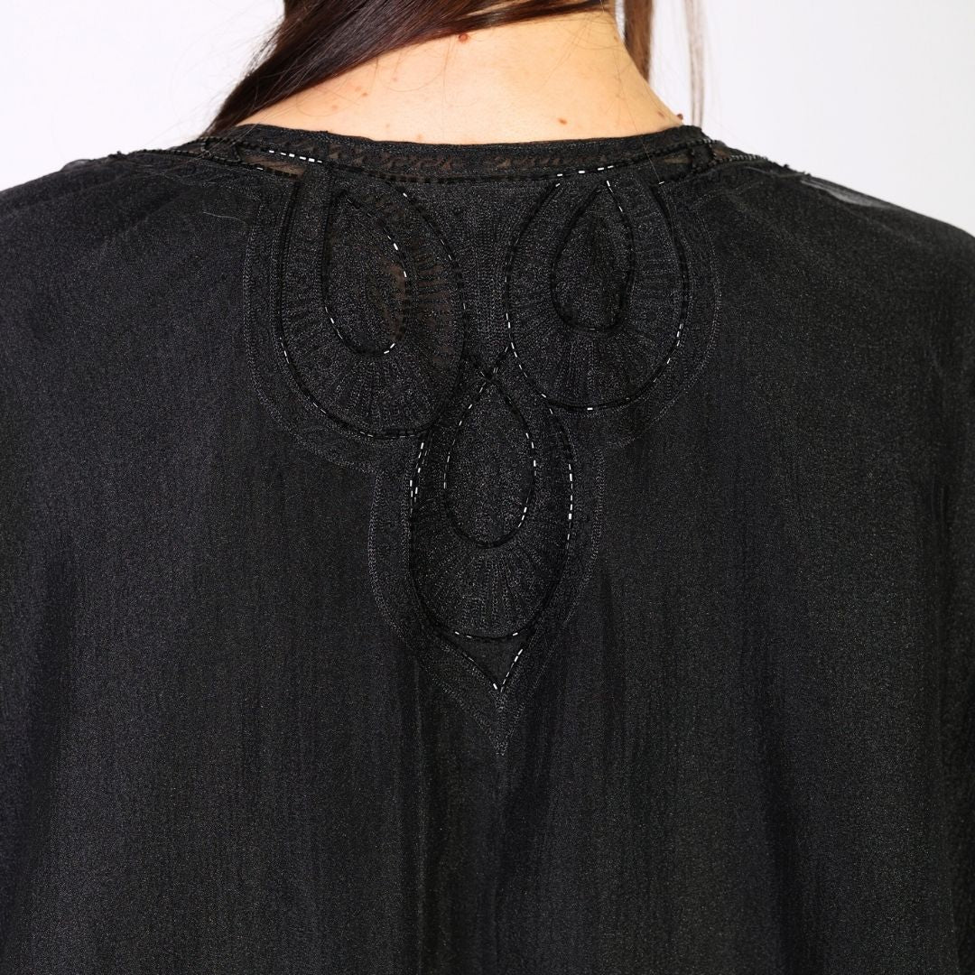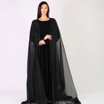A sophisticated black abaya featuring a flowing sheer cape layer that adds graceful movement with every step. The upper bodice is adorned with delicate black sequins, creating a subtle shimmer without overpowering the design. Perfect for evening occasions, formal gatherings, or elevating your everyday modest style.