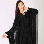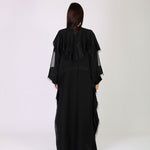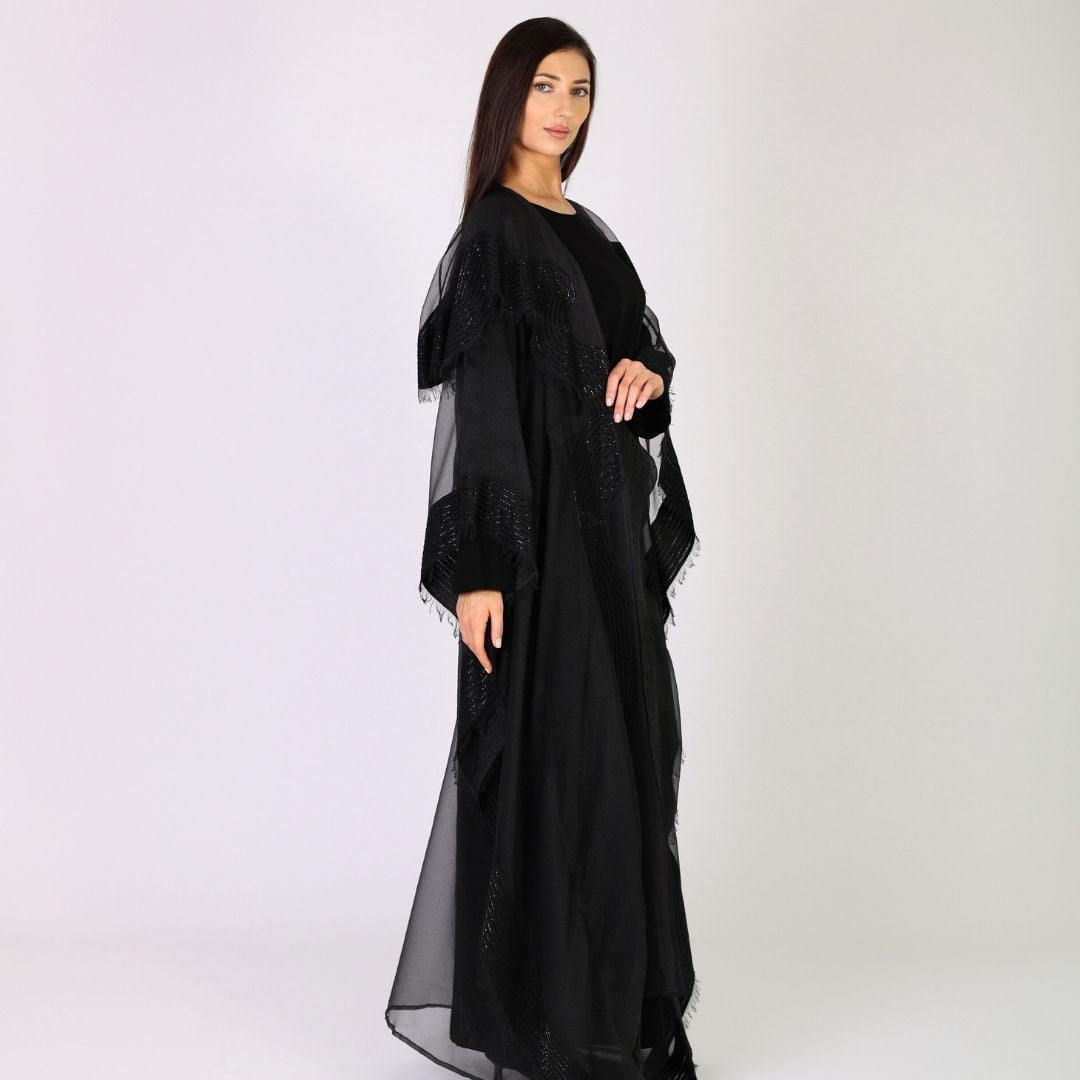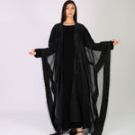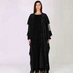 A sophisticated black abaya featuring a flowing sheer cape layer that adds graceful movement with every step. The upper bodice is adorned with delicate black sequins, creating a subtle shimmer without overpowering the design. Perfect for evening occasions, formal gatherings, or elevating your everyday modest style.