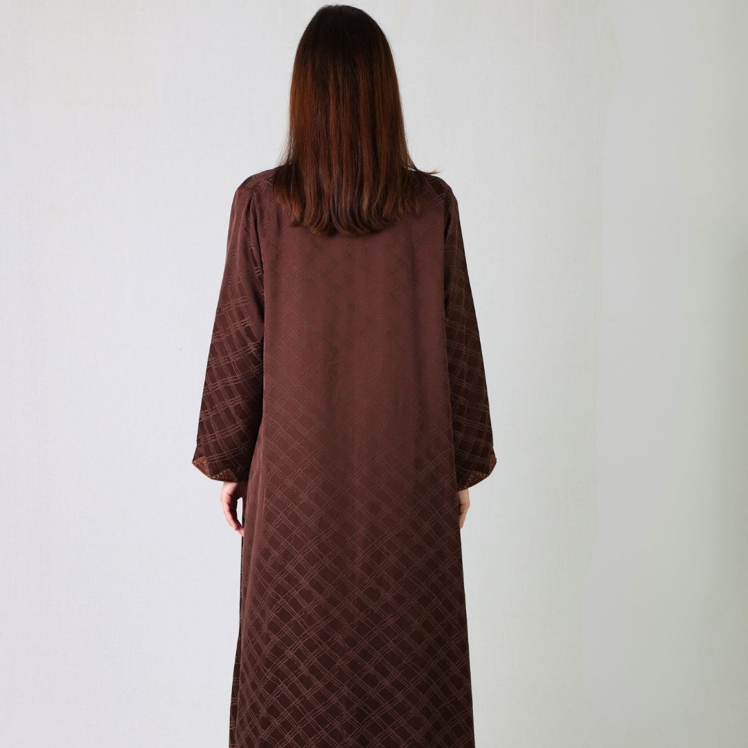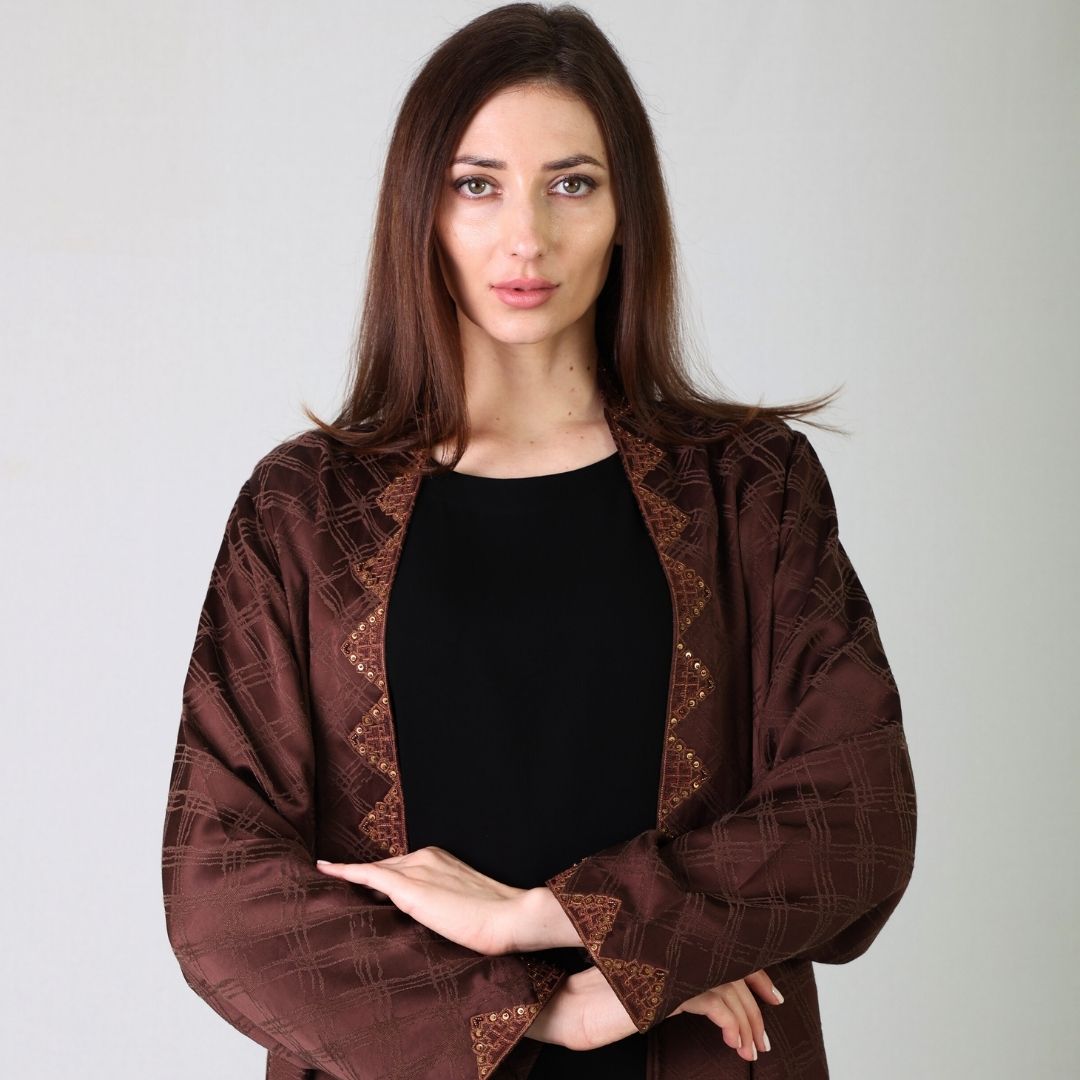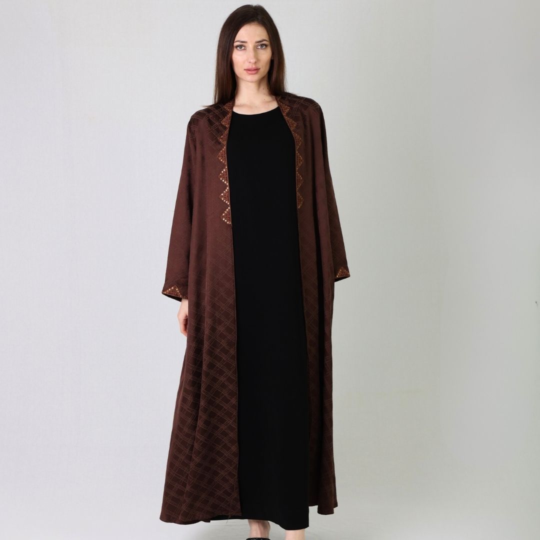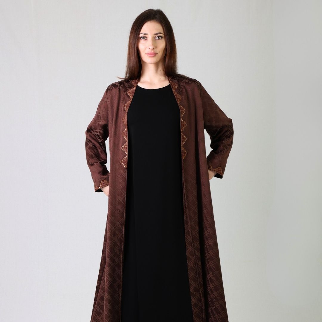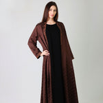 This timber abaya is perfect for chilly weather, featuring intricate thread work and delicate beading on the front and shyla, completing your elegant look.