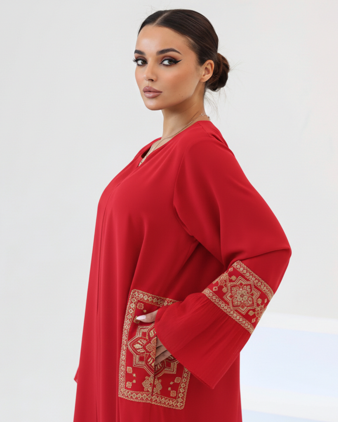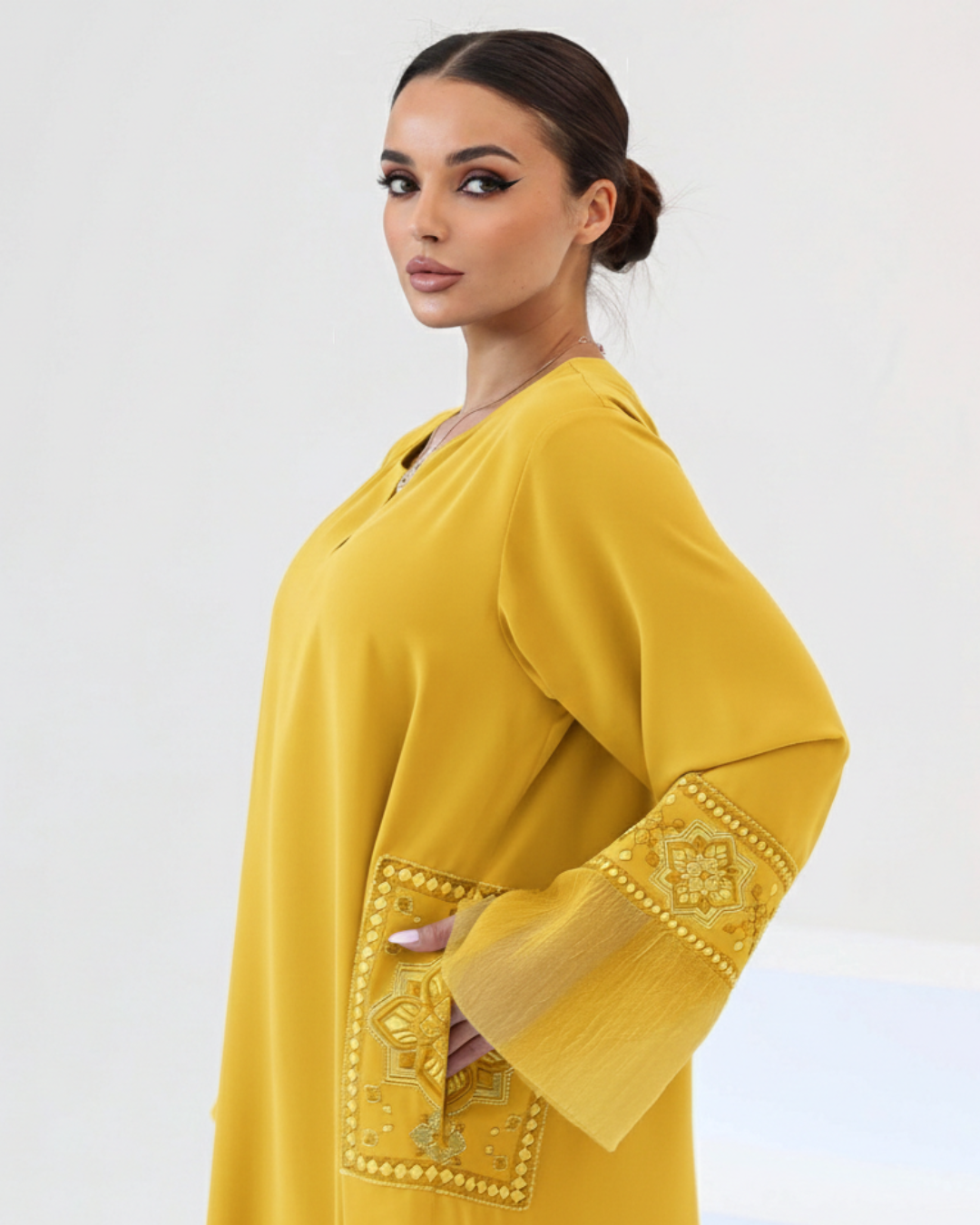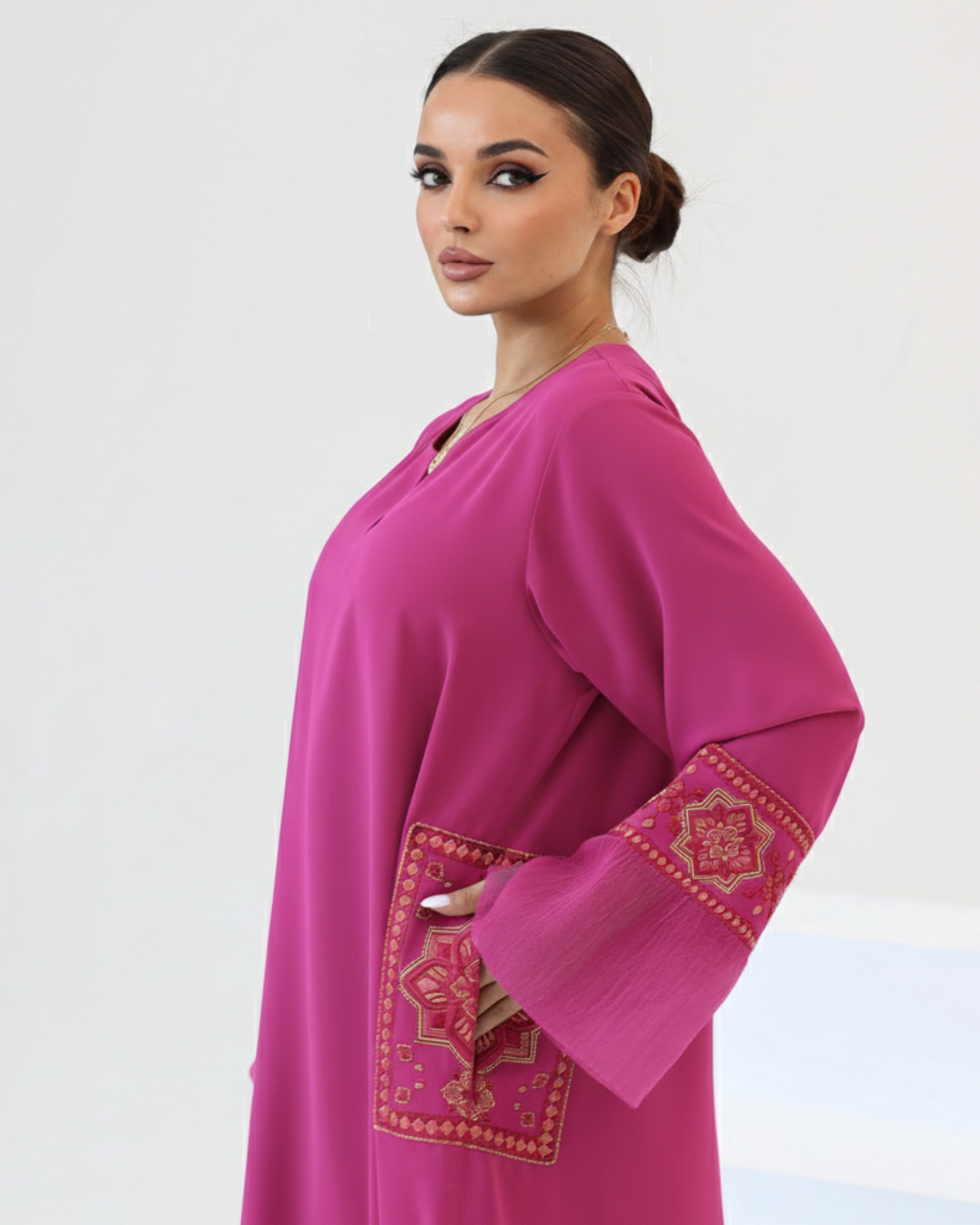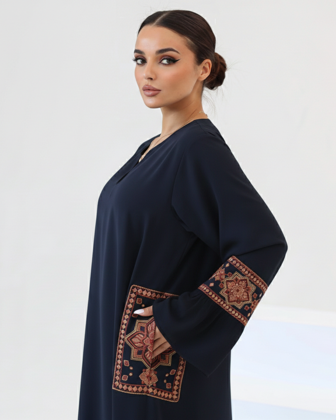 The defining feature of Grace is the meticulous silk thread embroidery that adorns the sleeves and pockets. This rich texture is further enhanced by a delicate hand-applied touch of beads and sequins, adding a shimmering depth that catches the light with every movement. Whether you are attending a daytime social or an evening celebration, this Jalabiya offers a regal look that never goes unnoticed.