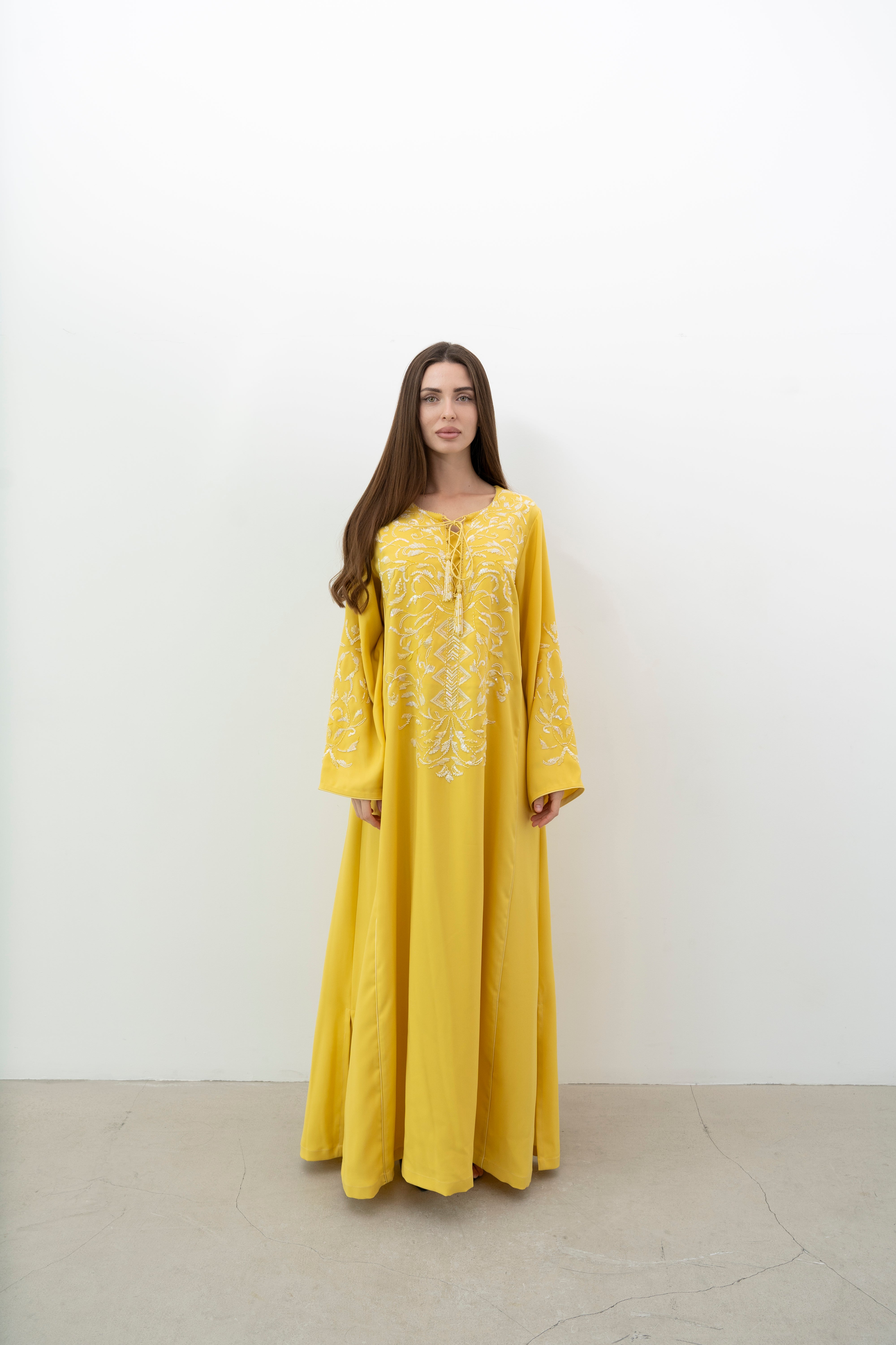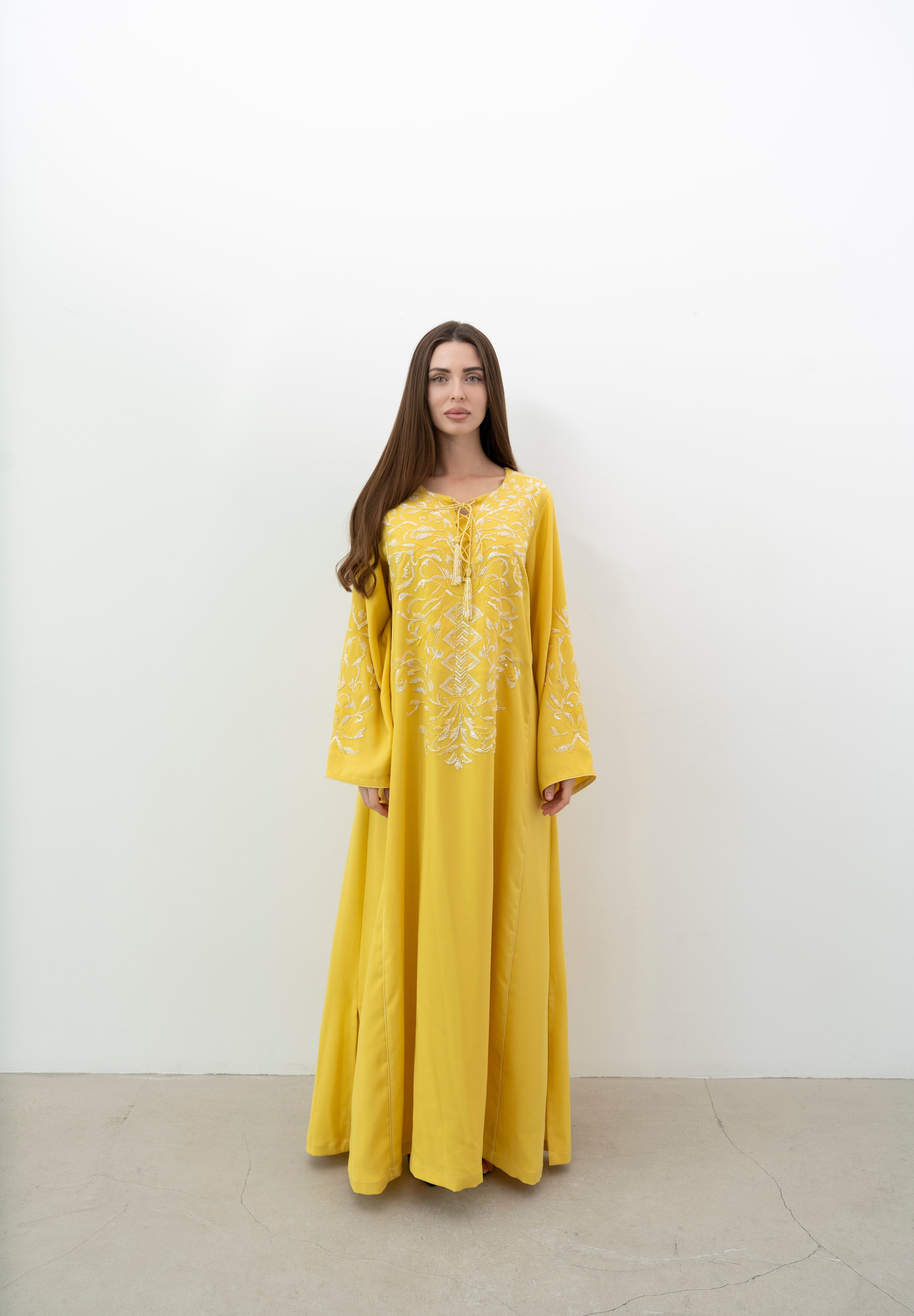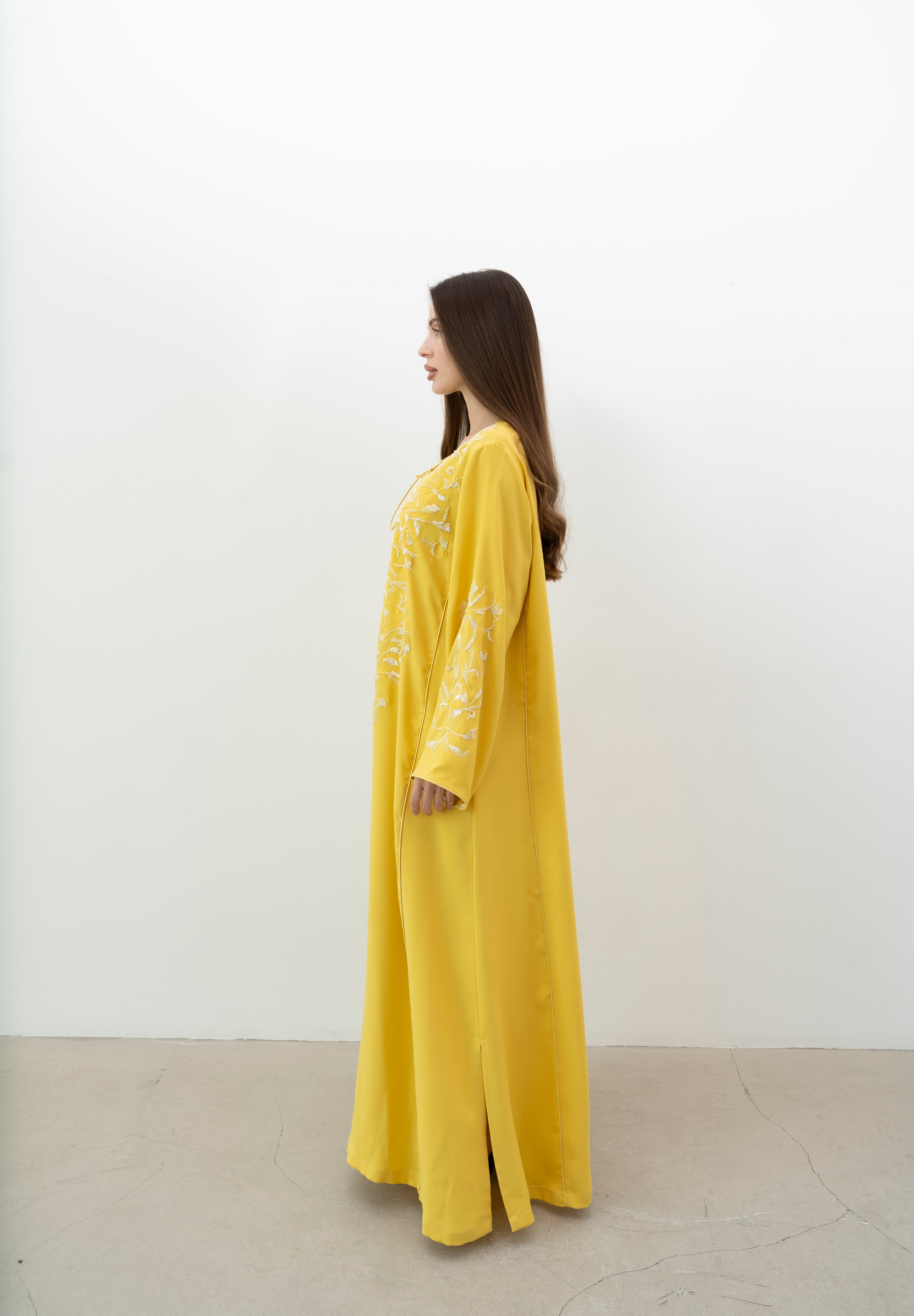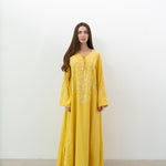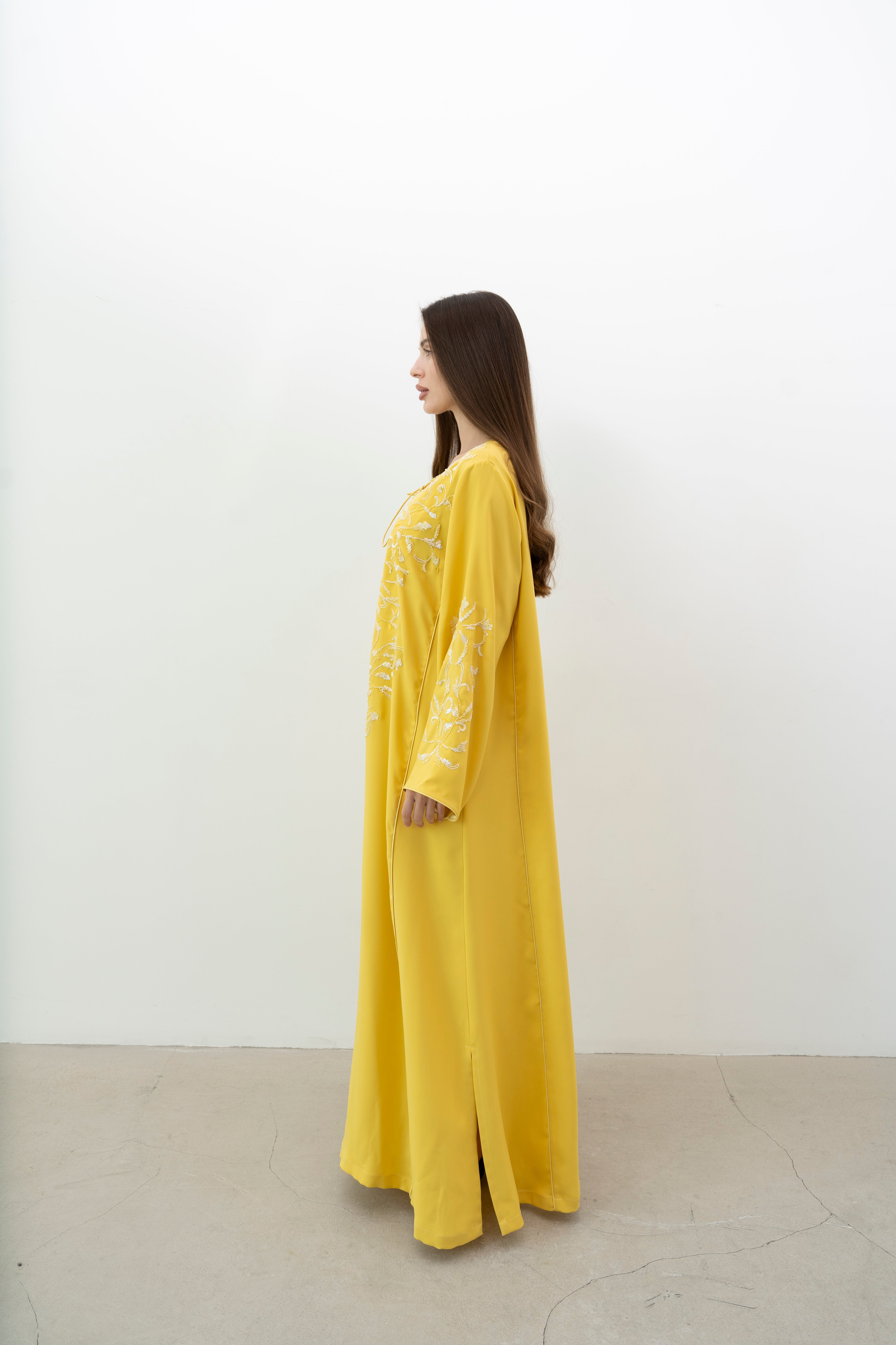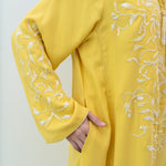 A stunning silk jalabiya adorned with sequins, beads, and intricate hand embroidery. The mix of patterns adds elegance, making it perfect for any outing.