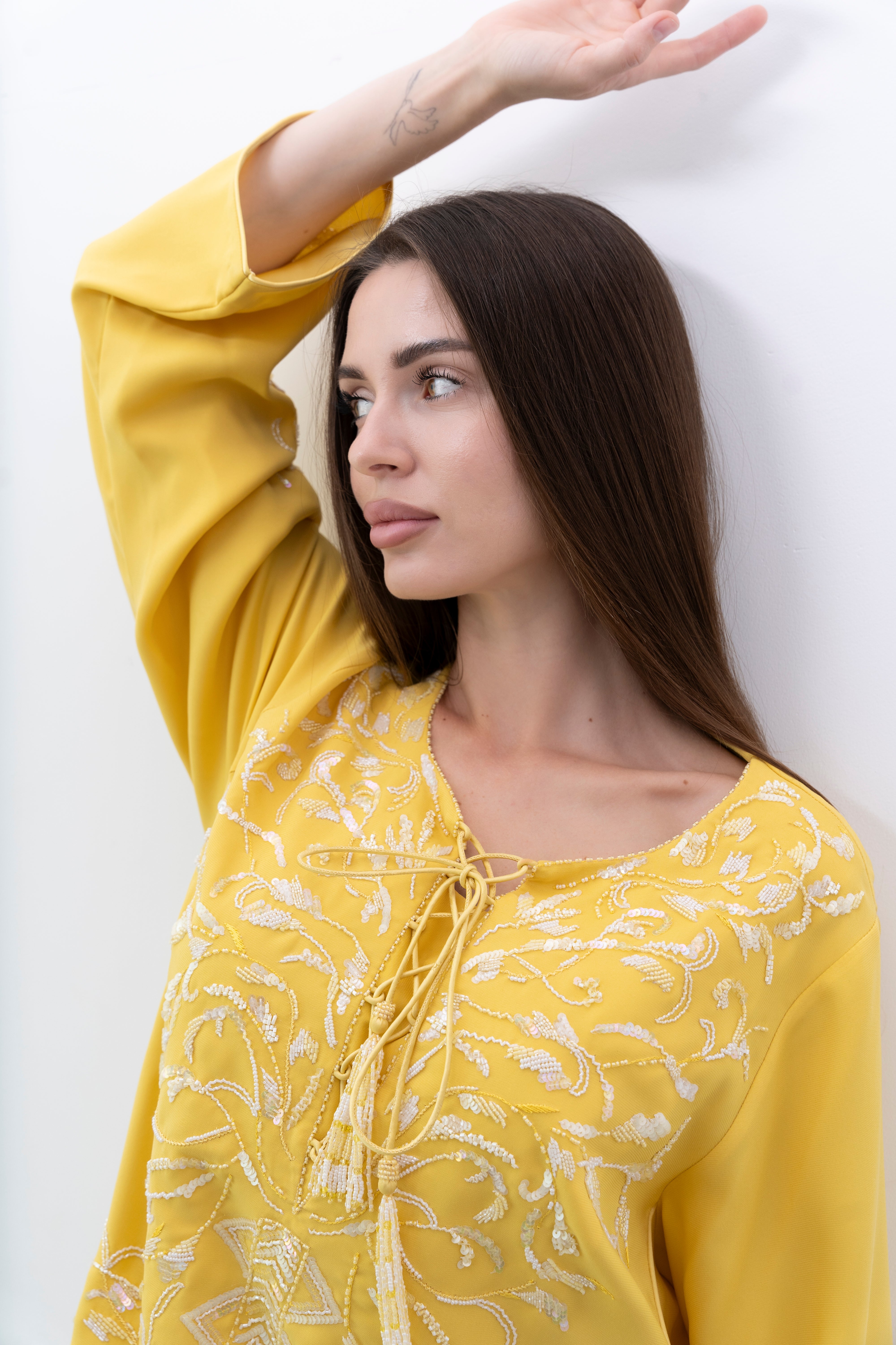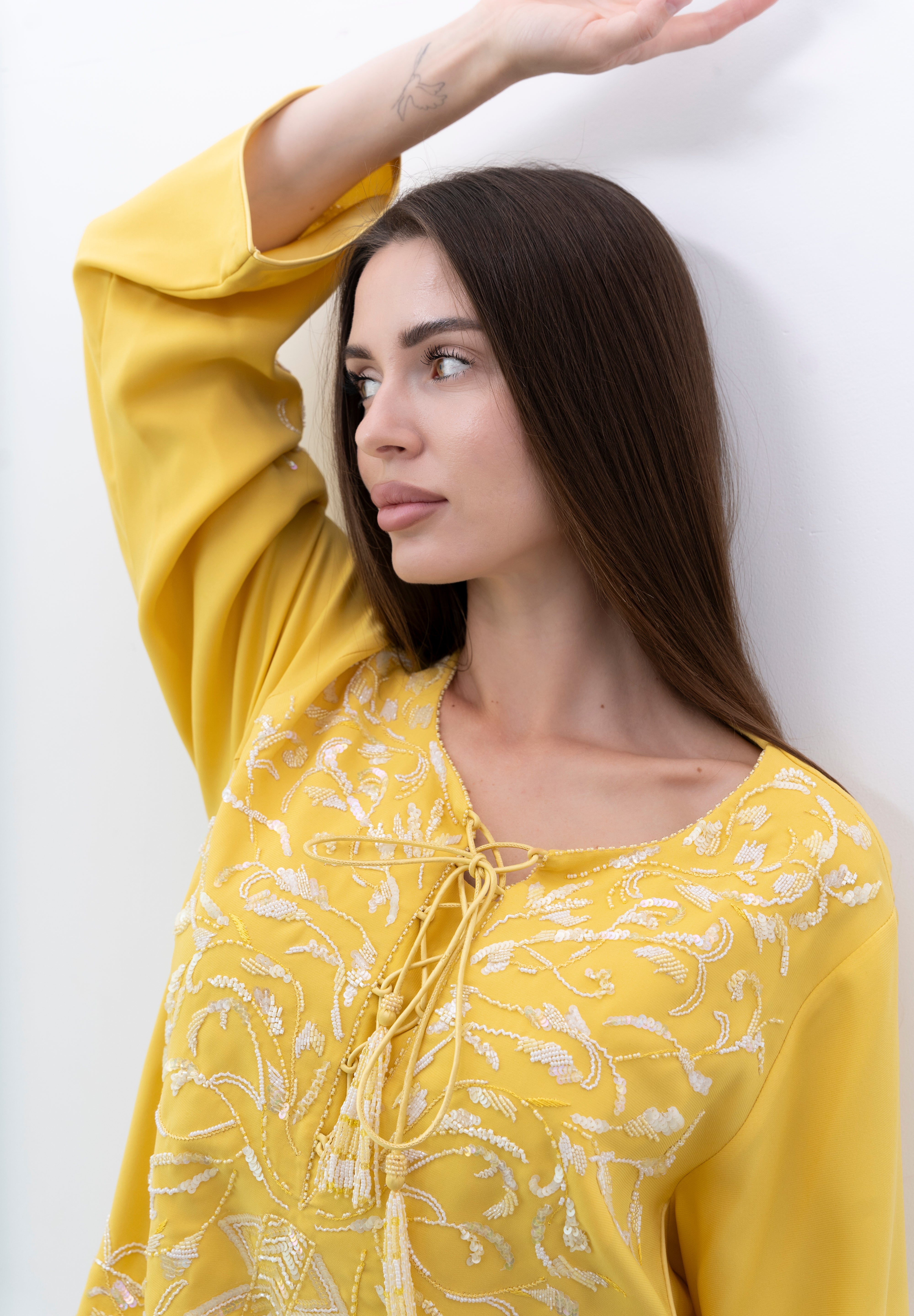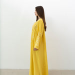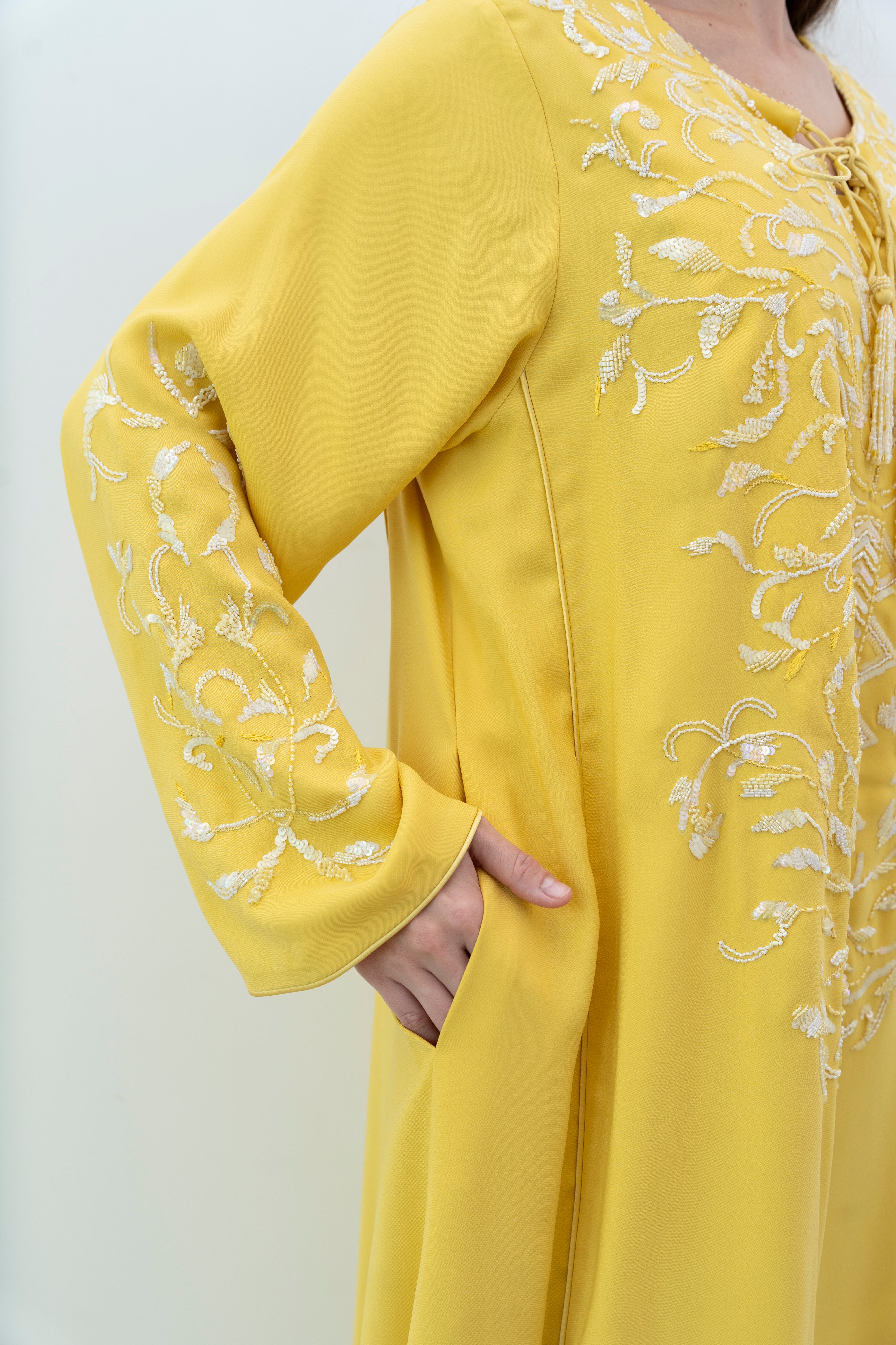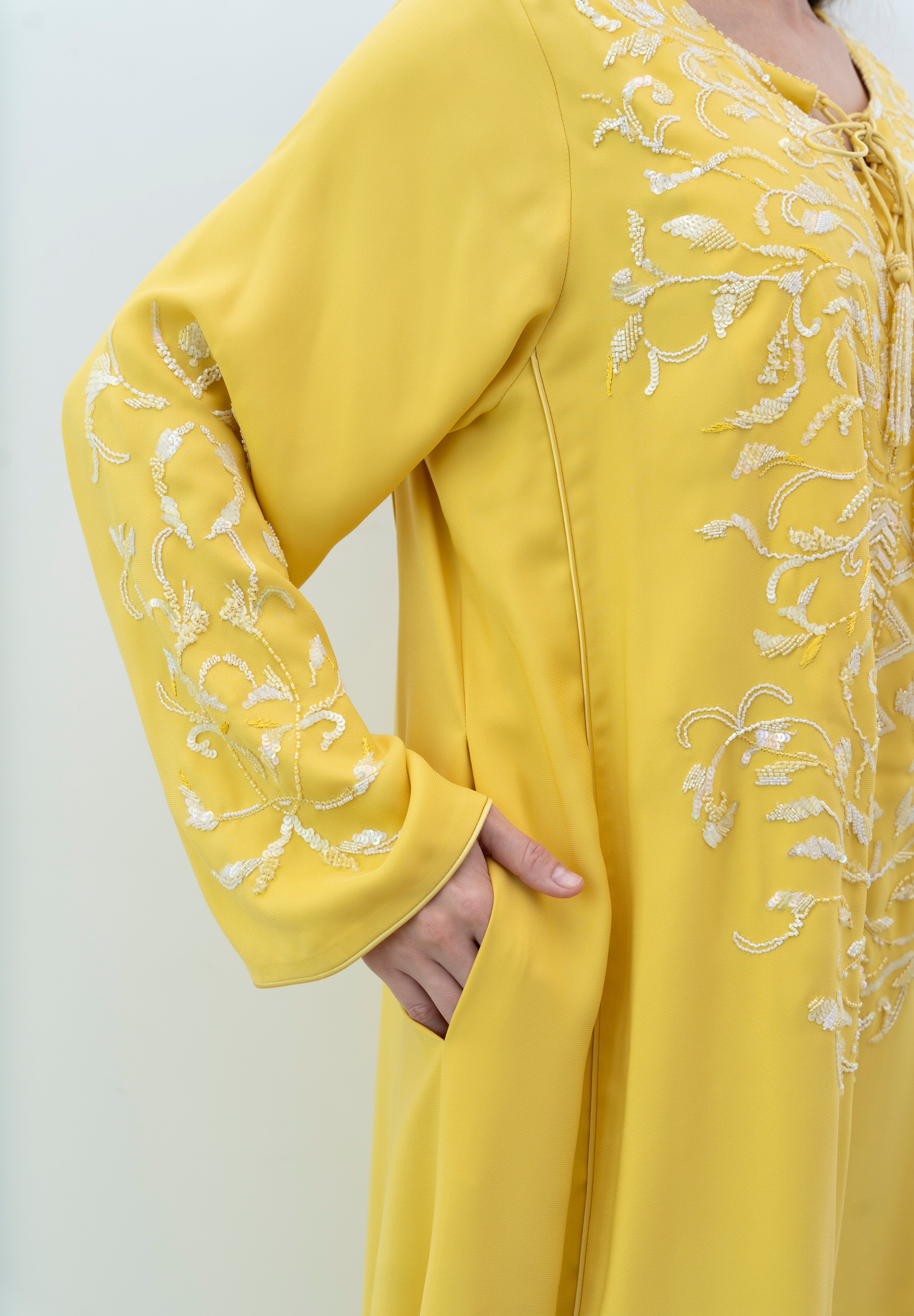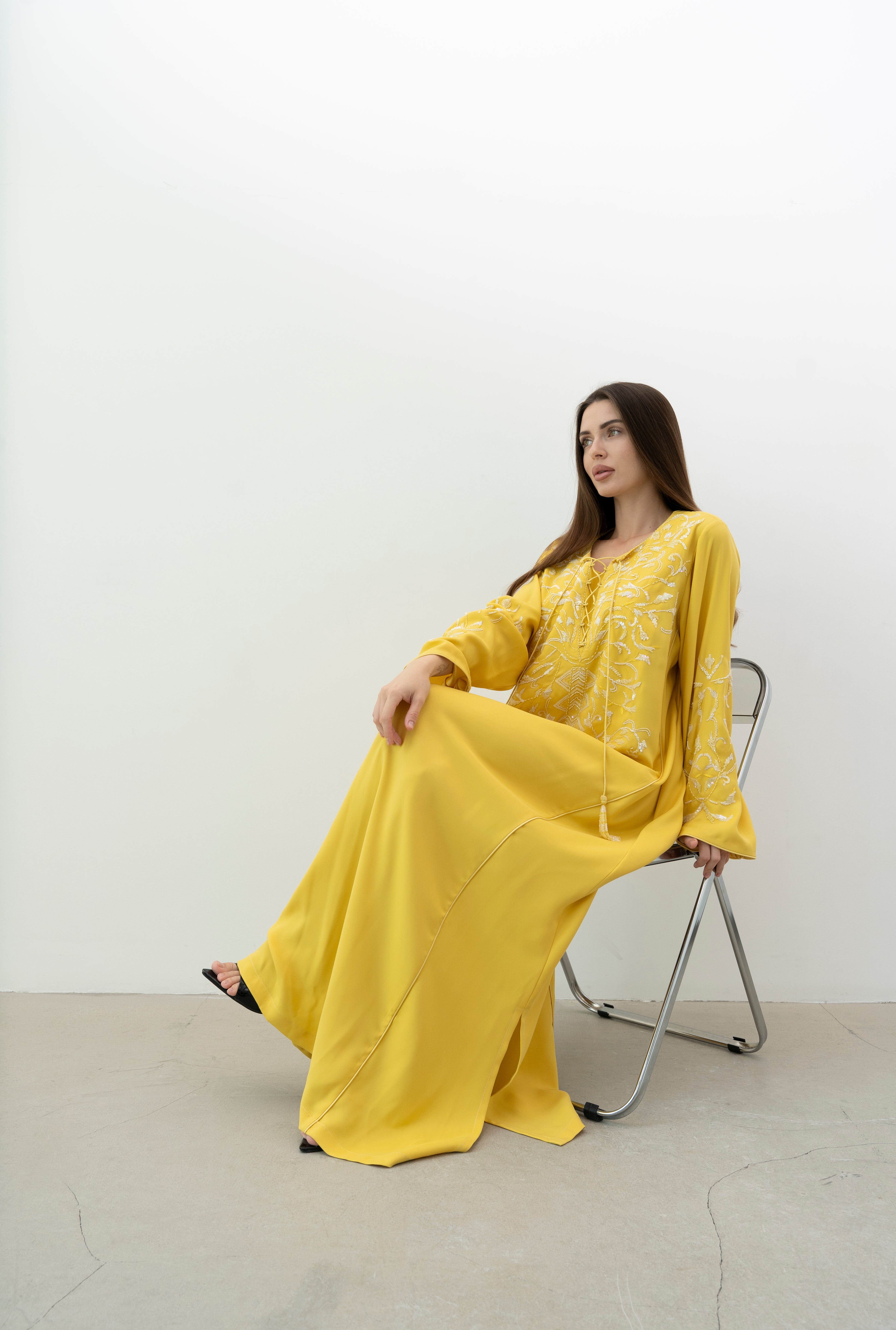A stunning silk jalabiya adorned with sequins, beads, and intricate hand embroidery. The mix of patterns adds elegance, making it perfect for any outing.