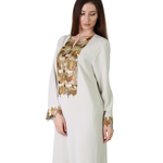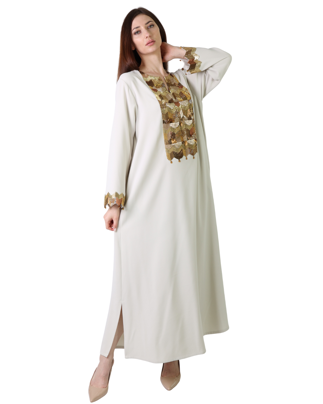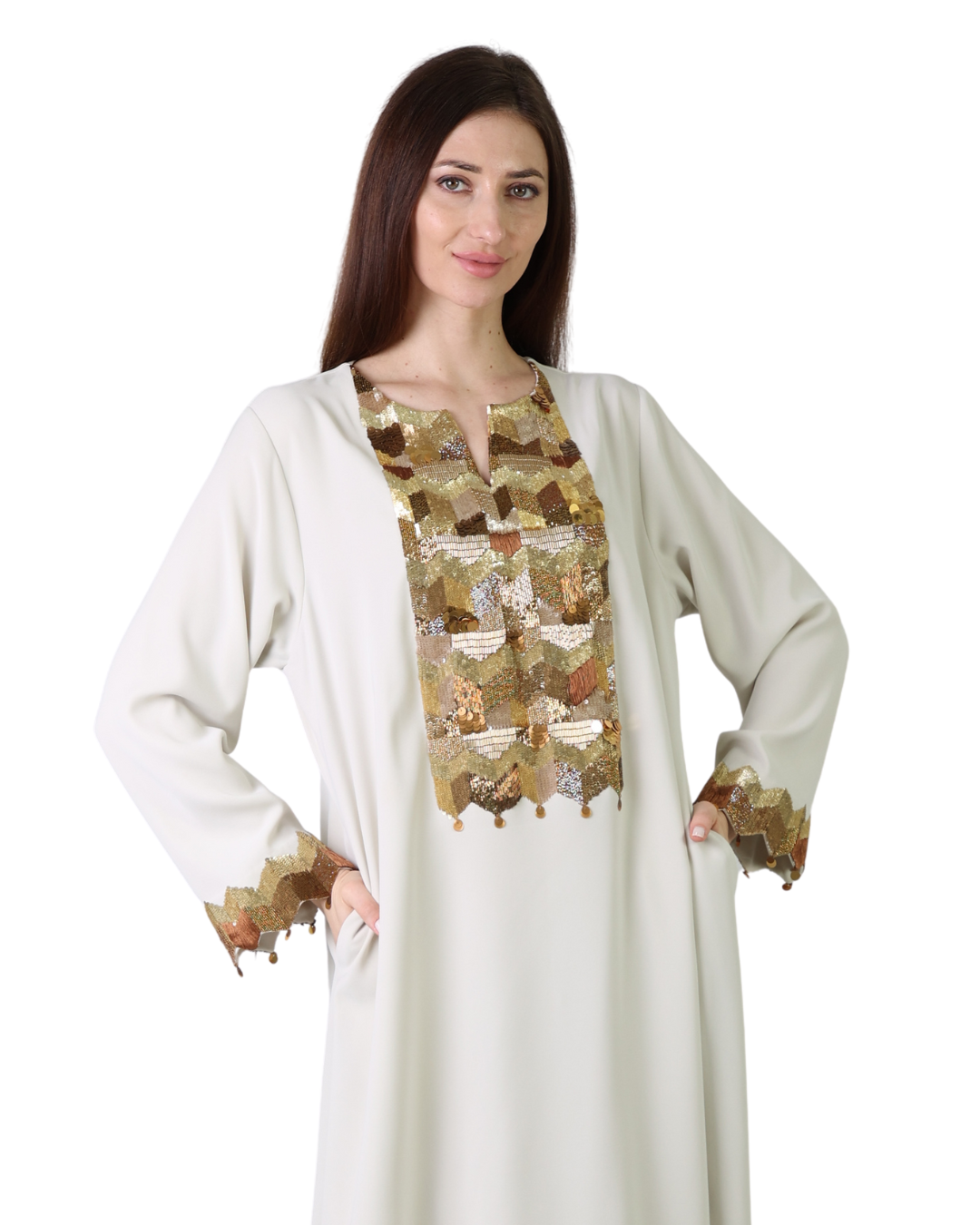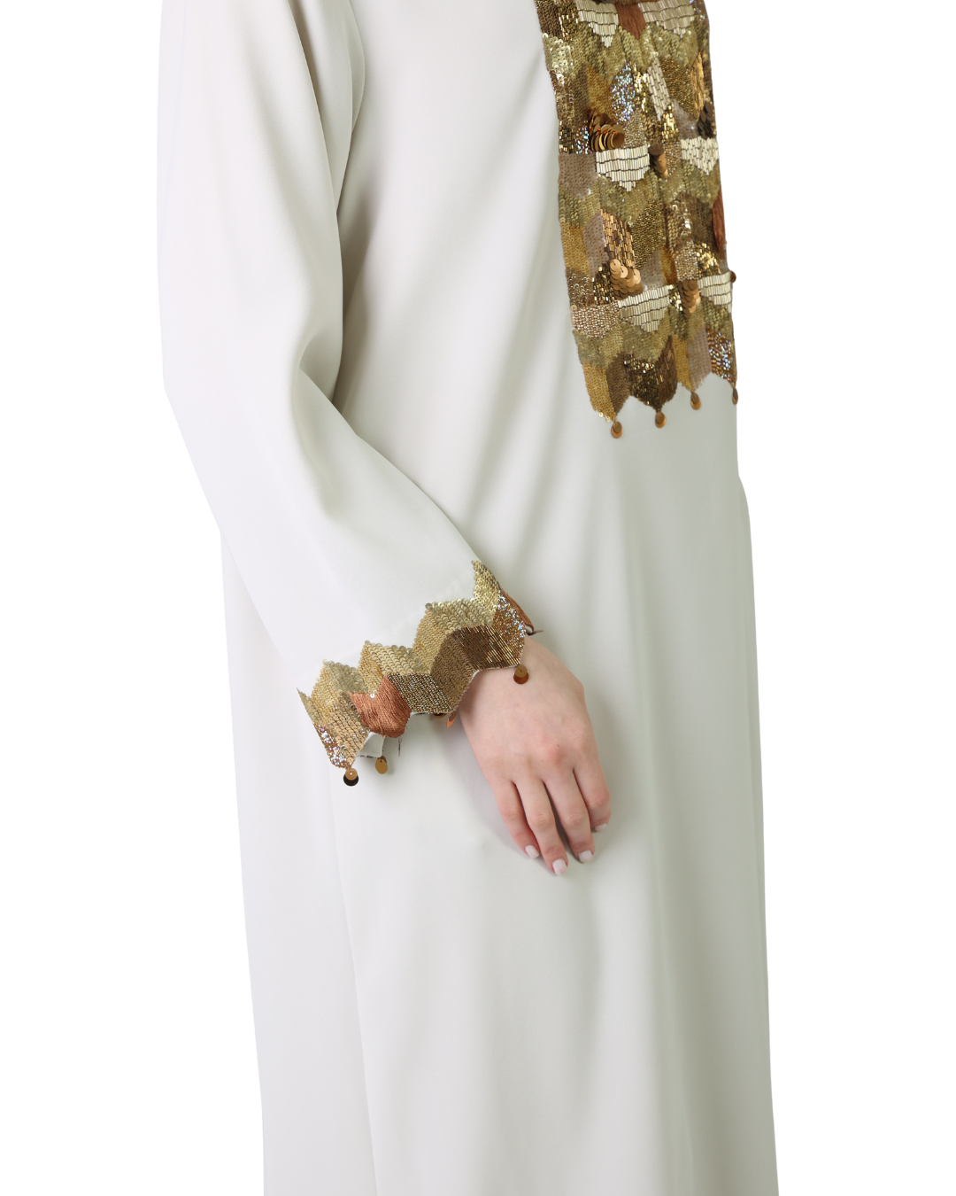 An elegant jalabiya designed with a soft, flowing silhouette and a beautifully embroidered front panel in rich gold tones. The subtle neckline slit and refined detailing create a timeless look that blends tradition with modern sophistication.