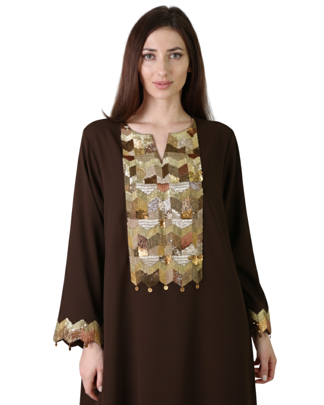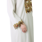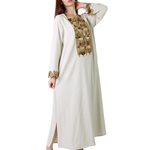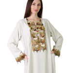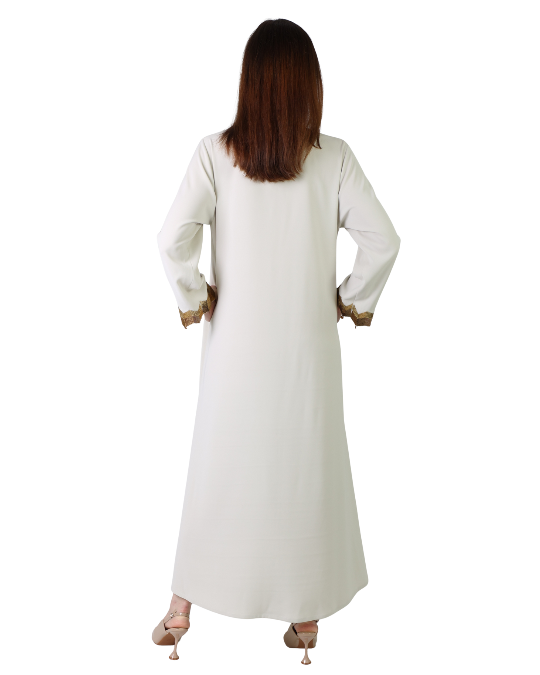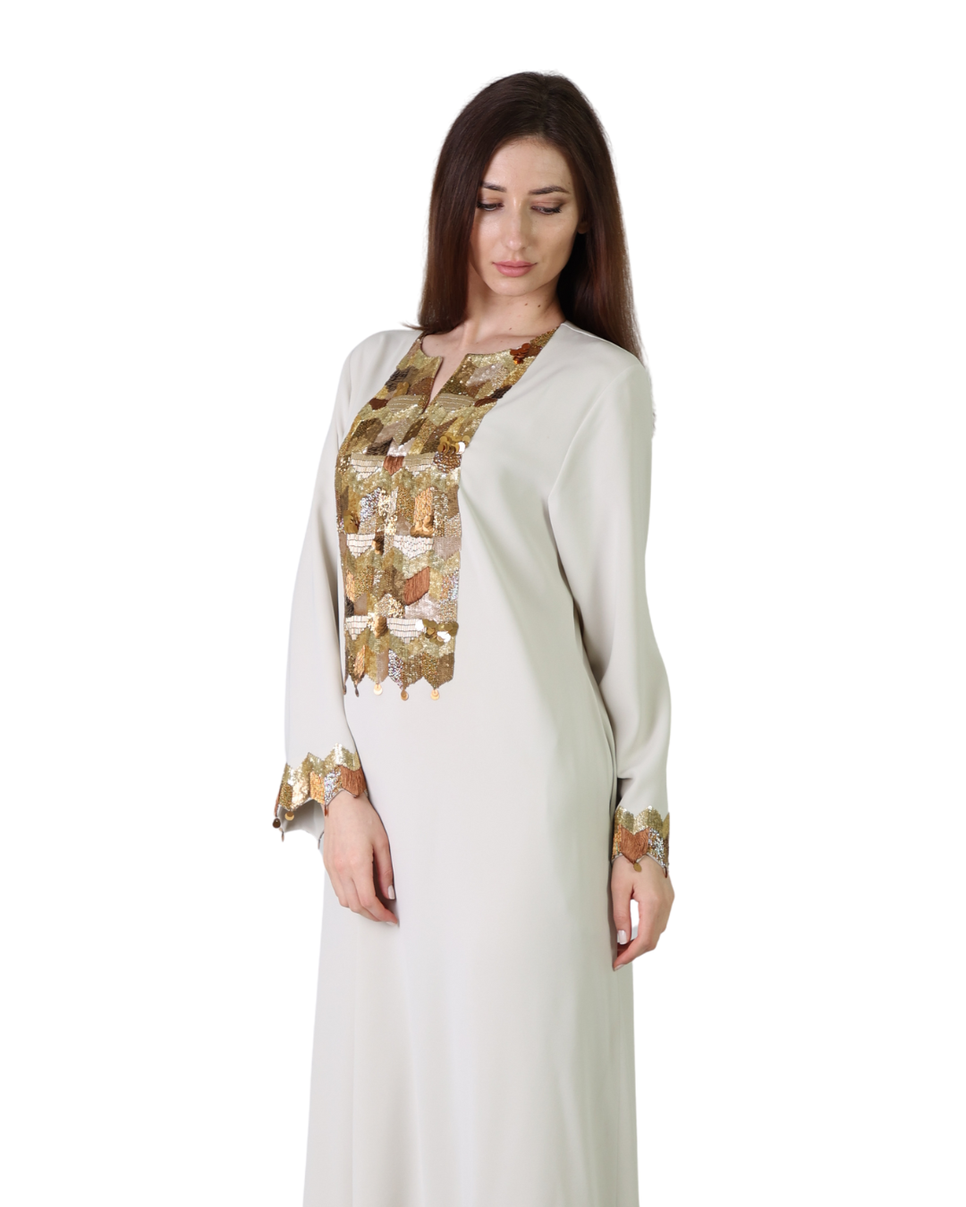 An elegant jalabiya designed with a soft, flowing silhouette and a beautifully embroidered front panel in rich gold tones. The subtle neckline slit and refined detailing create a timeless look that blends tradition with modern sophistication.