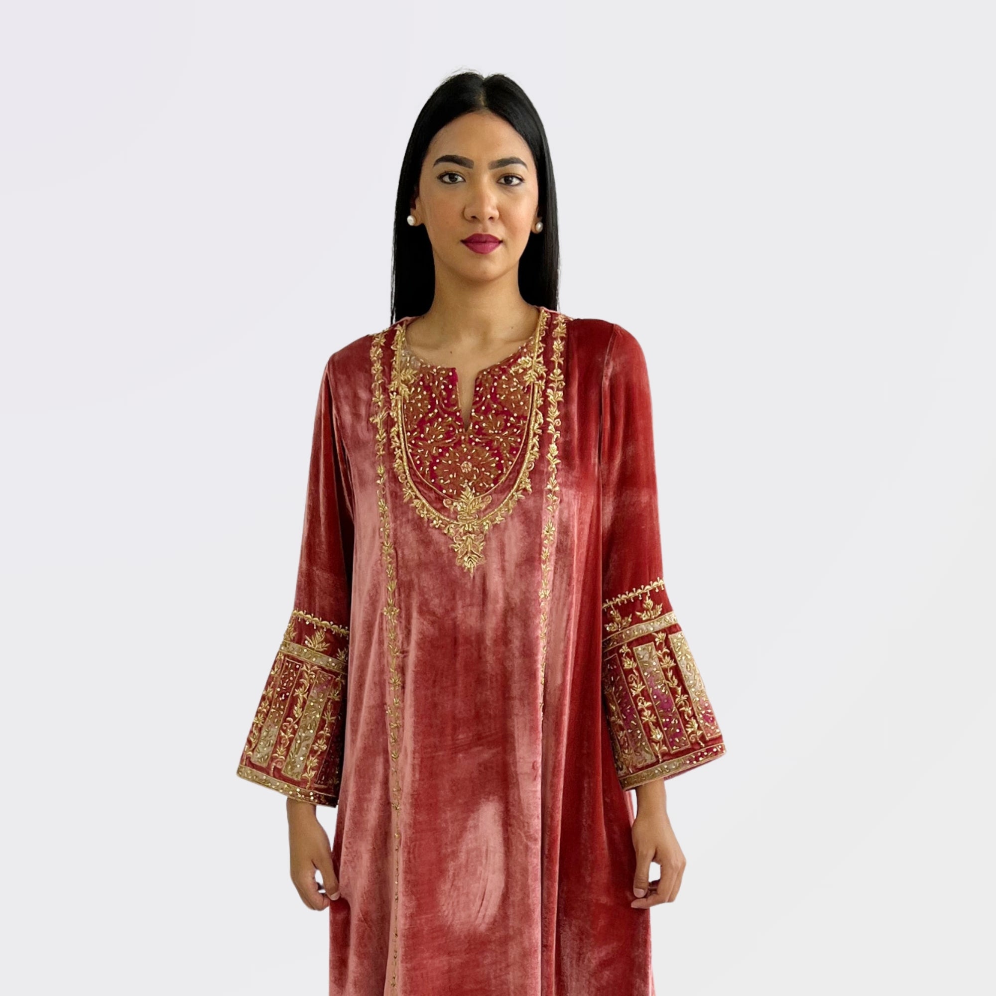 This Rosette Velvet Jalabiya showcases a luxurious pink-toned velvet, enriched with intricate Dabka, beadwork and antique sequin details on the neckline. The Golden Banaras panel with its ornate motifs beautifully contrasts with the rich velvet.