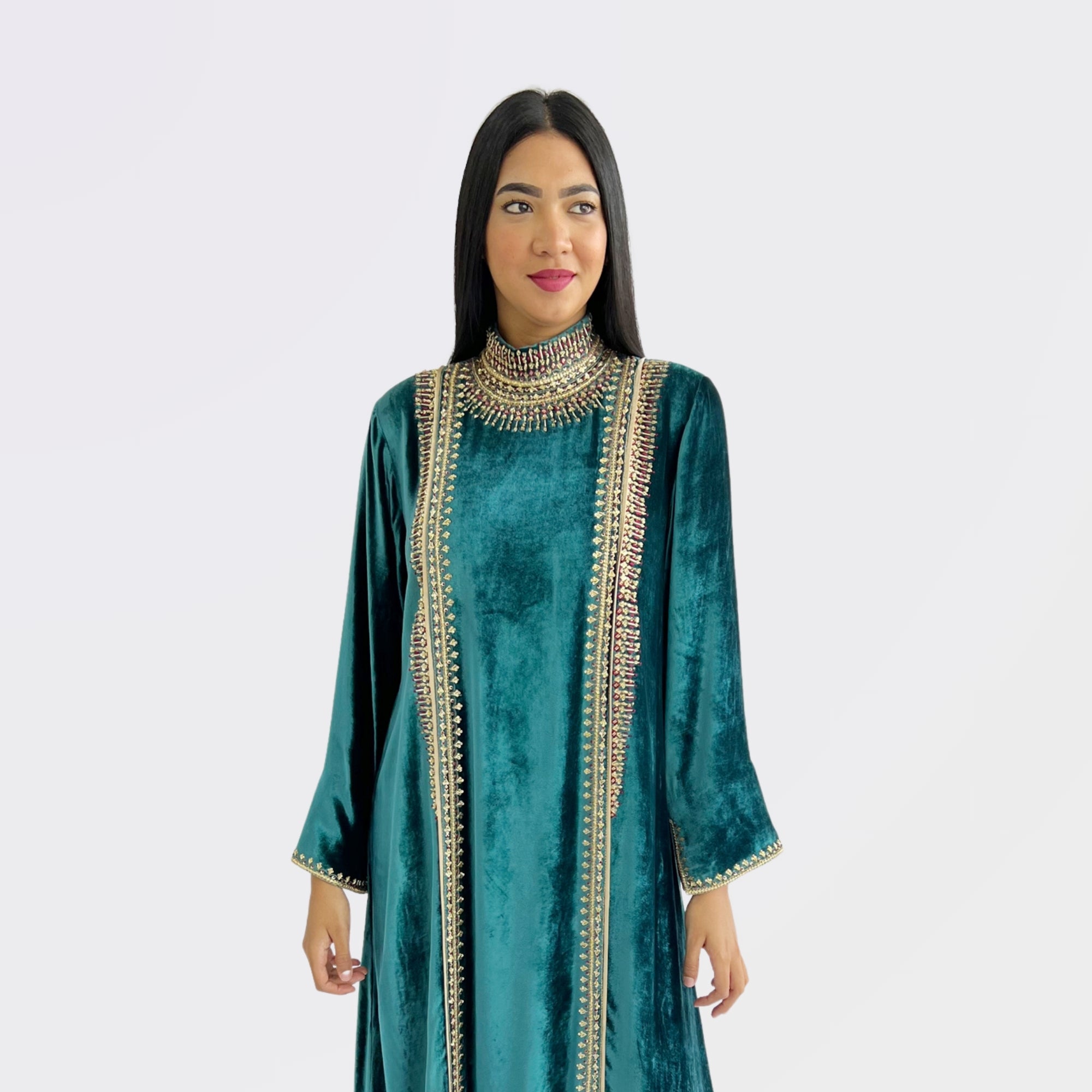 Rich velvet fabric is used to create this opulent teal kaftan-style dress. Small beads are used to provide a royal look to the detail nakshi work (a style of embroidery at times using metallic threads) on the central panel and high neck. A lovely frame is created by the silk thread needlework that runs along the front. Additionally, the dress features Banaras trimmings that delicately accentuate its elegance by adding a classic elements to the slits and sleeve cuts.