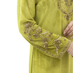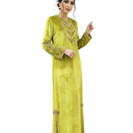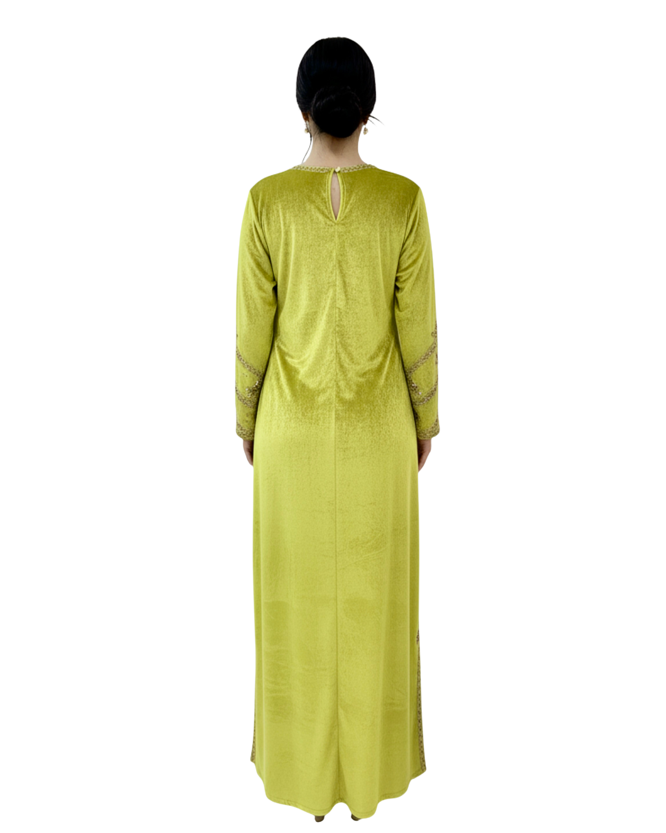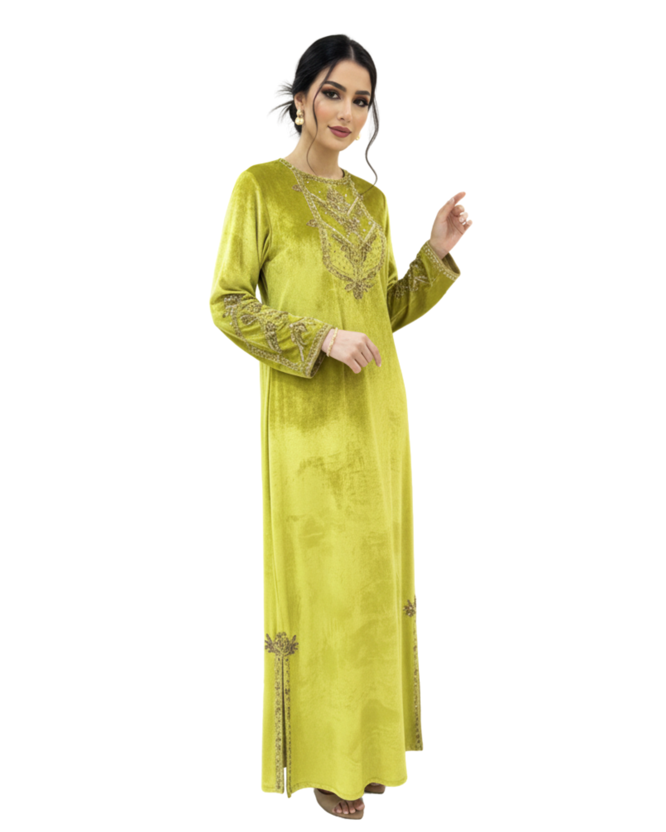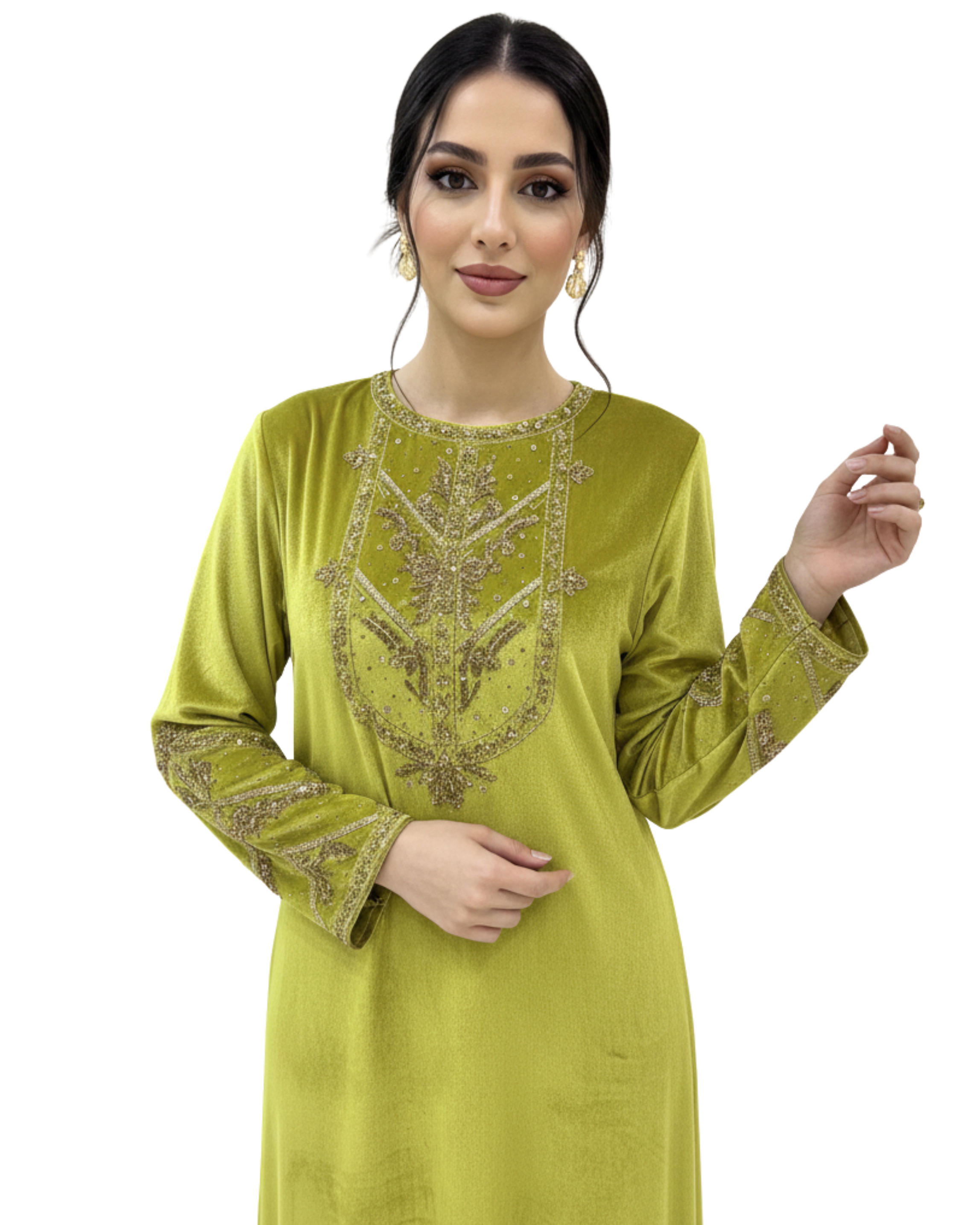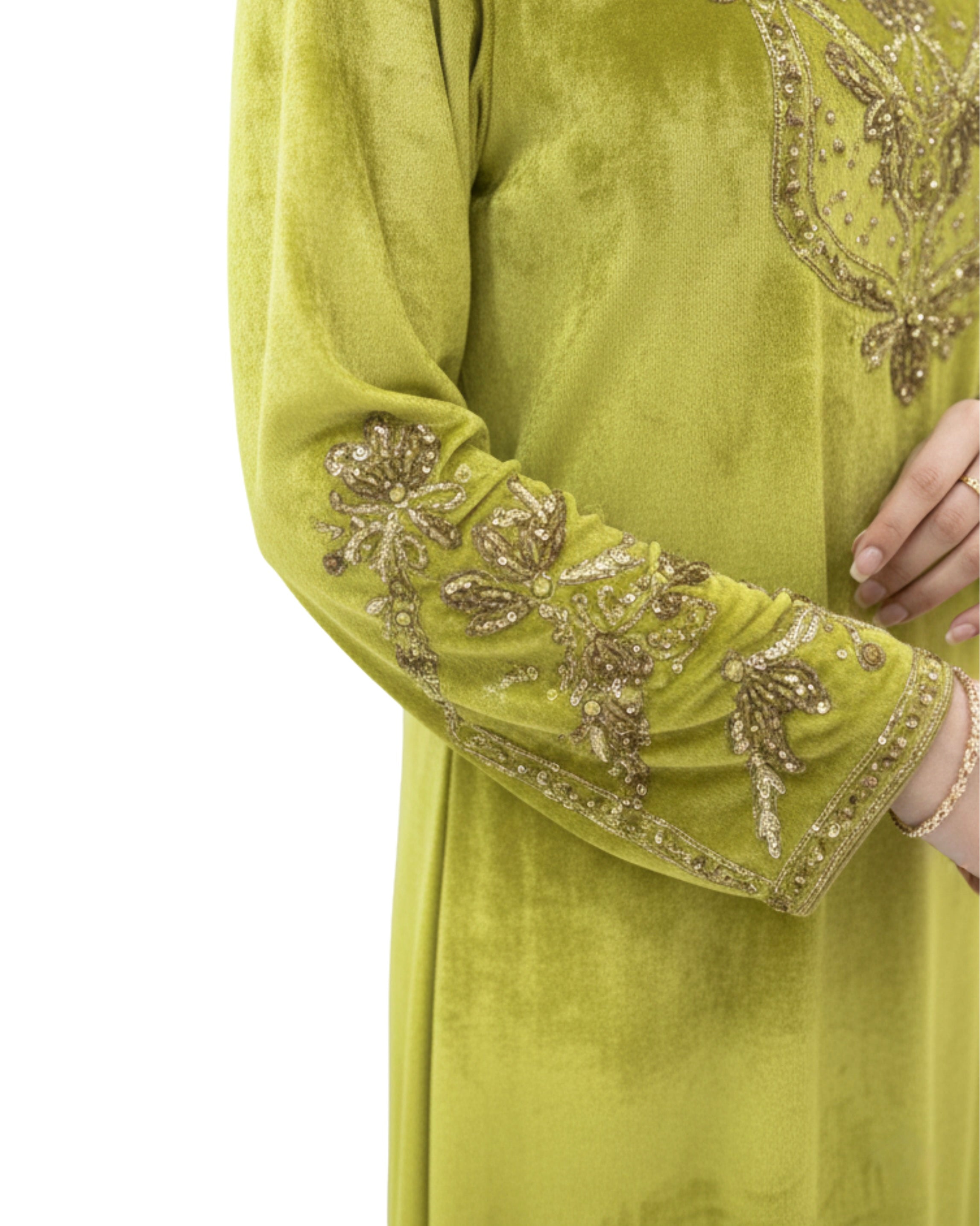 Embrace understated elegance with Zahra, a refined velvet jalabiya crafted for effortless sophistication. Designed in a soft olive green velvet, this piece features delicate gold embroidery on the neckline and sleeves, adding a graceful traditional touch while maintaining a minimal, modern appeal.
