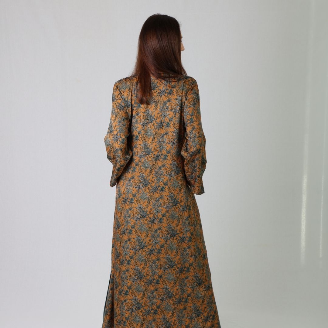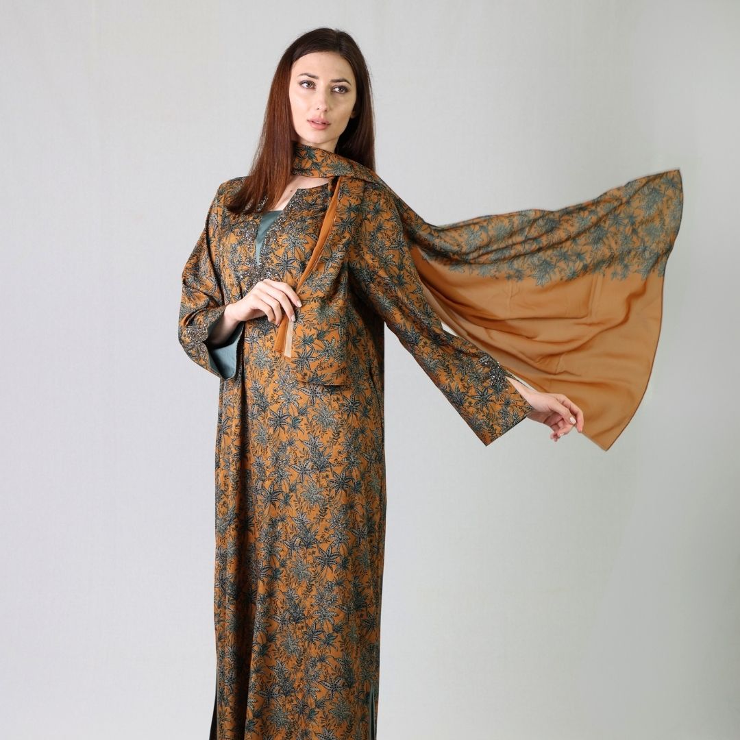 Step into timeless elegance with our Amber Palm Luxe Kaftan, crafted from soft, flowy fabric featuring intricate palm-inspired prints in warm amber and deep green hues. The kaftan’s relaxed silhouette, delicate embroidery along the neckline and sleeves, and subtle side slits make it perfect for both casual gatherings and refined evenings. Pair it with nude heels or sandals for a graceful, effortless look.