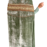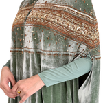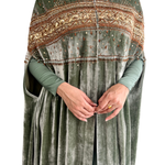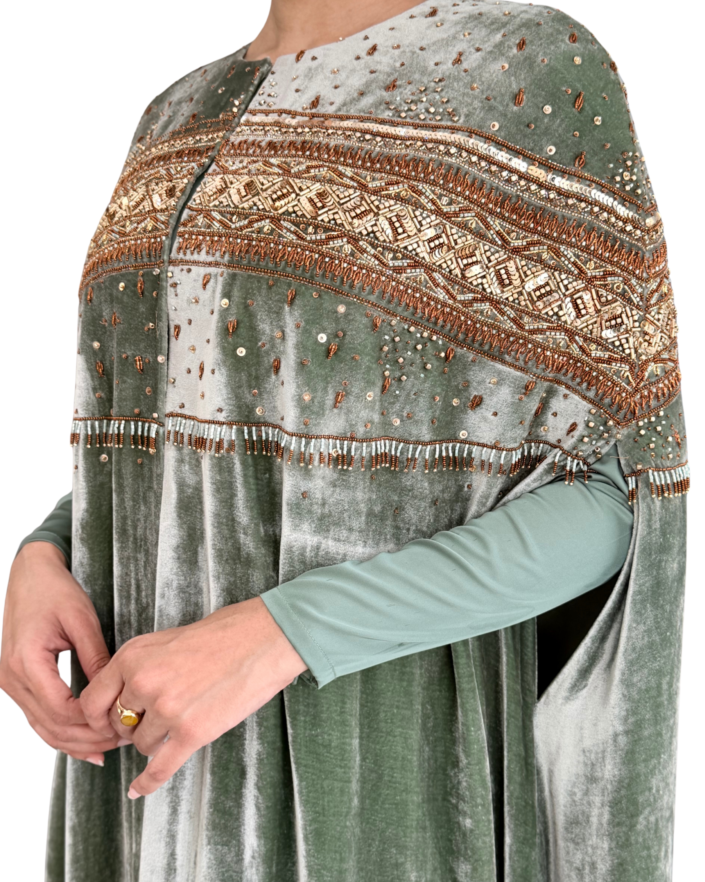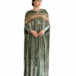 This luxurious two-piece ensemble combines a sleek inner column dress with a dramatic, velvet kaftan-style jacket.