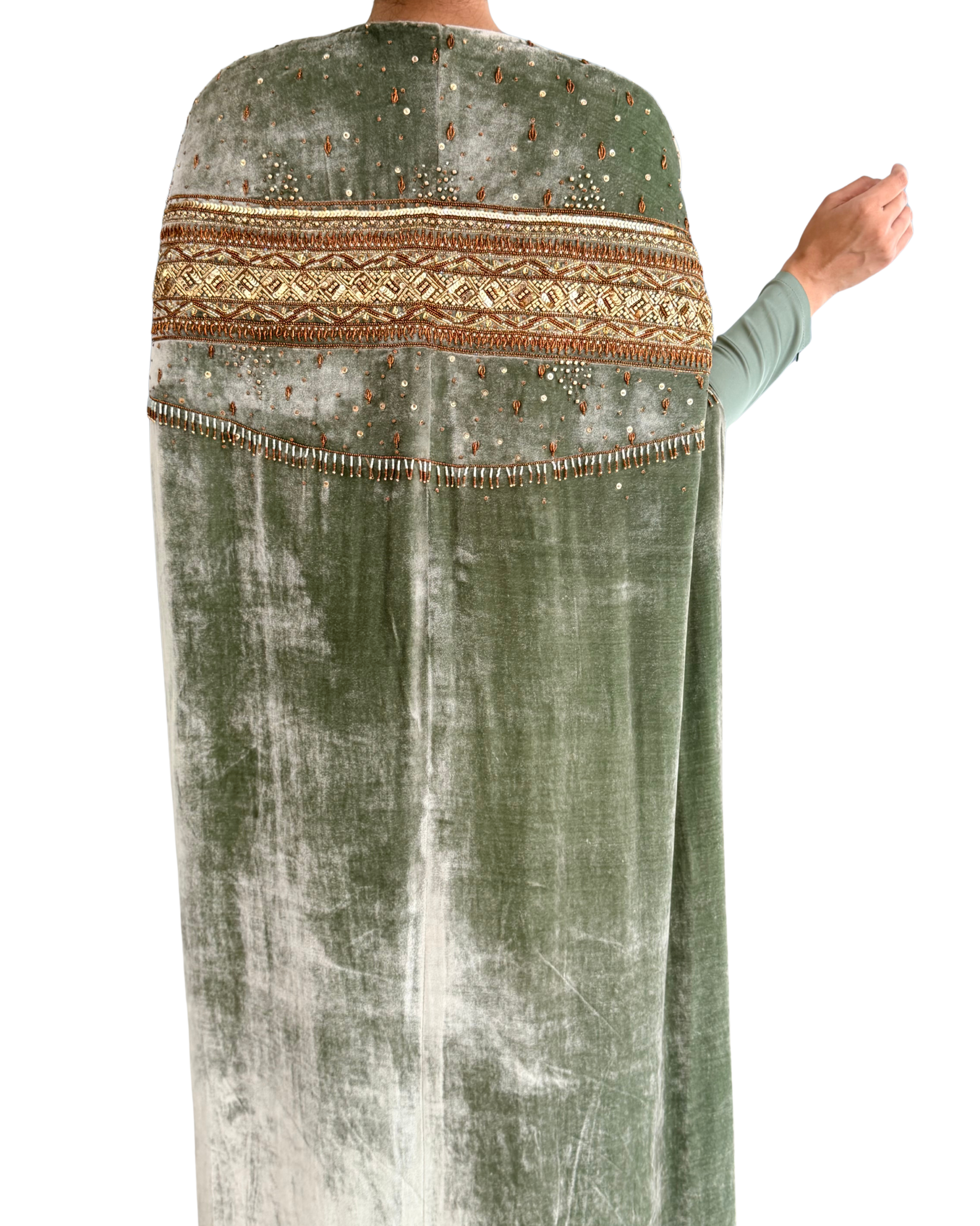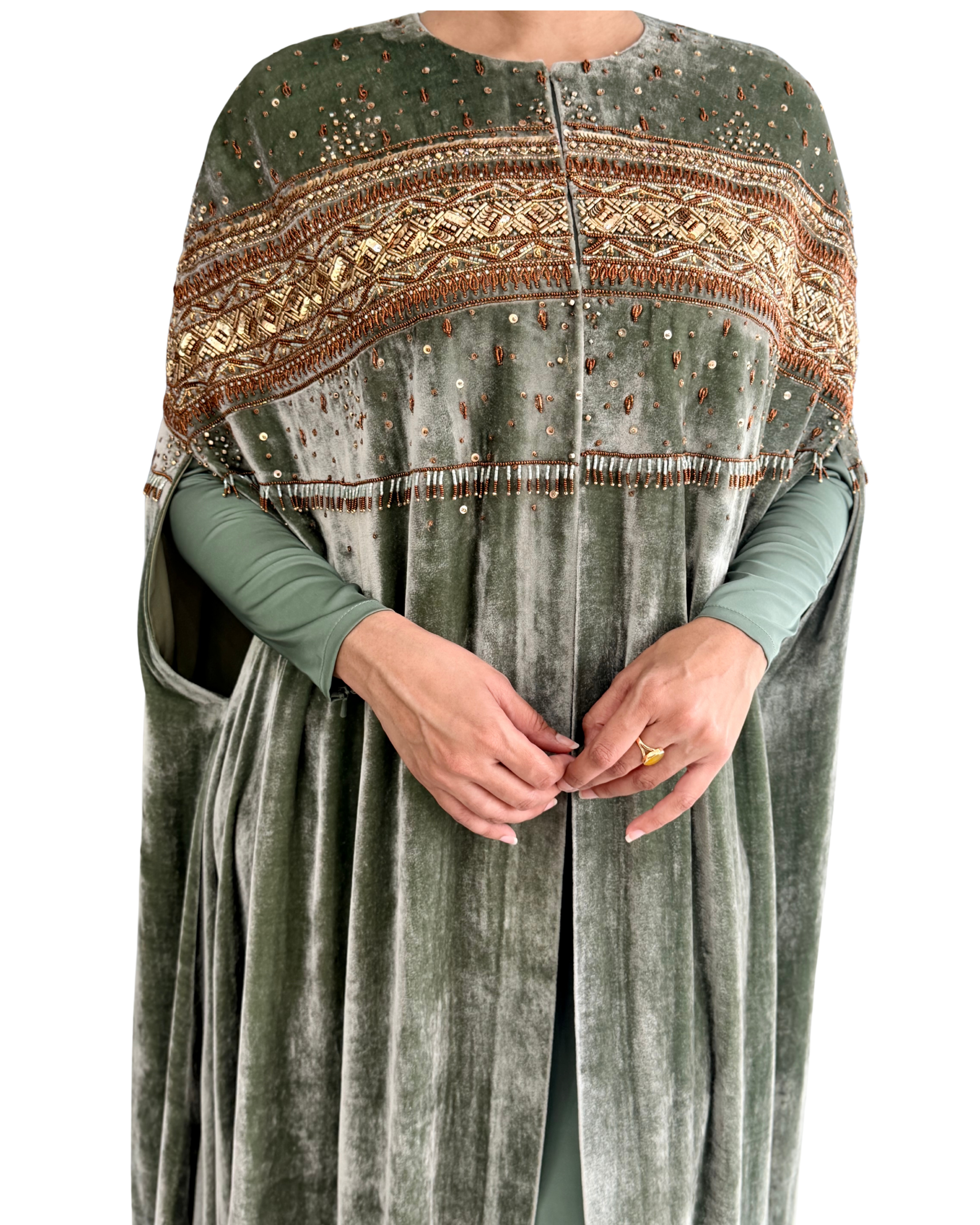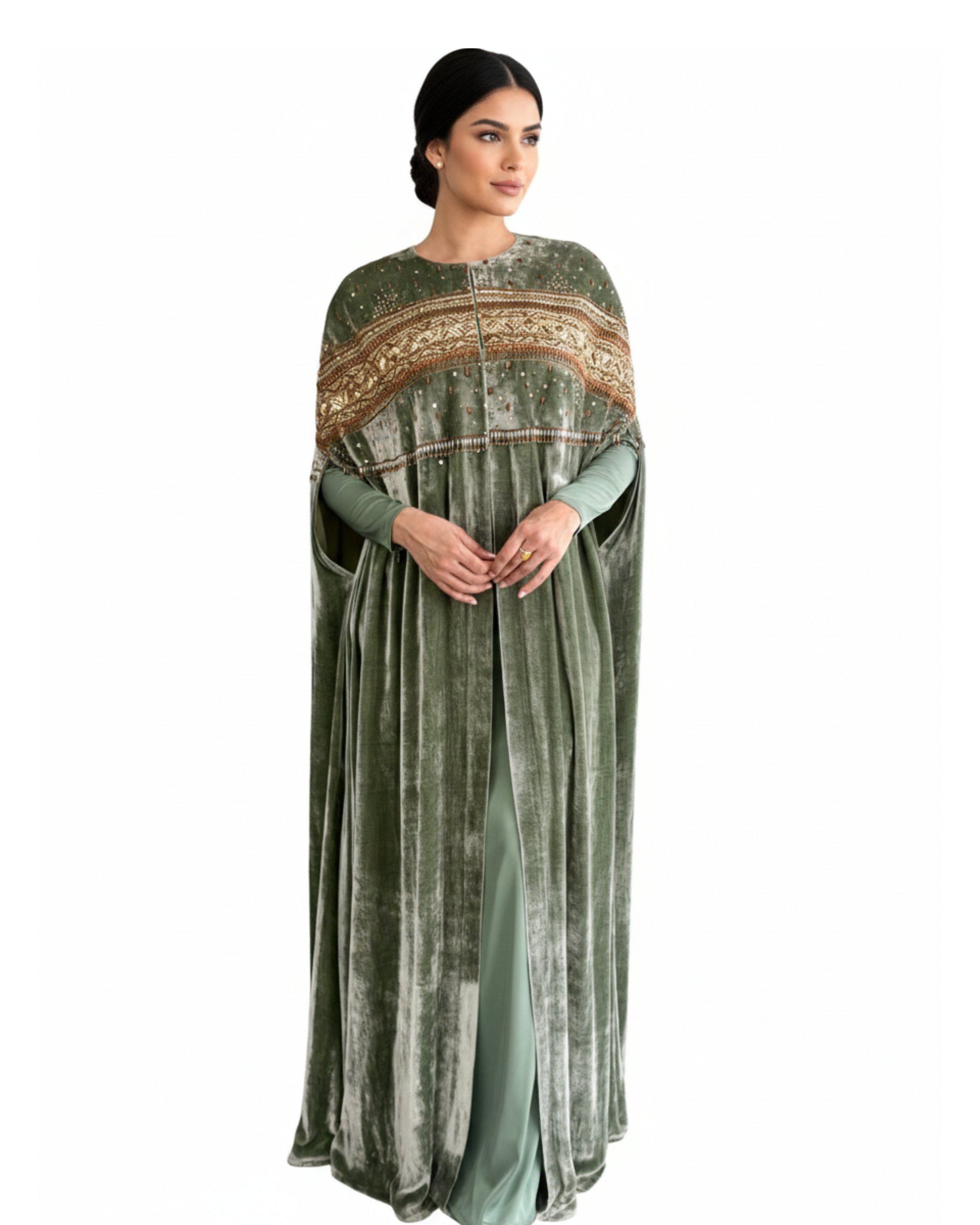 The Jacket: A heavy-draped velvet cape featuring a majestic open-front silhouette and voluminous sleeves.