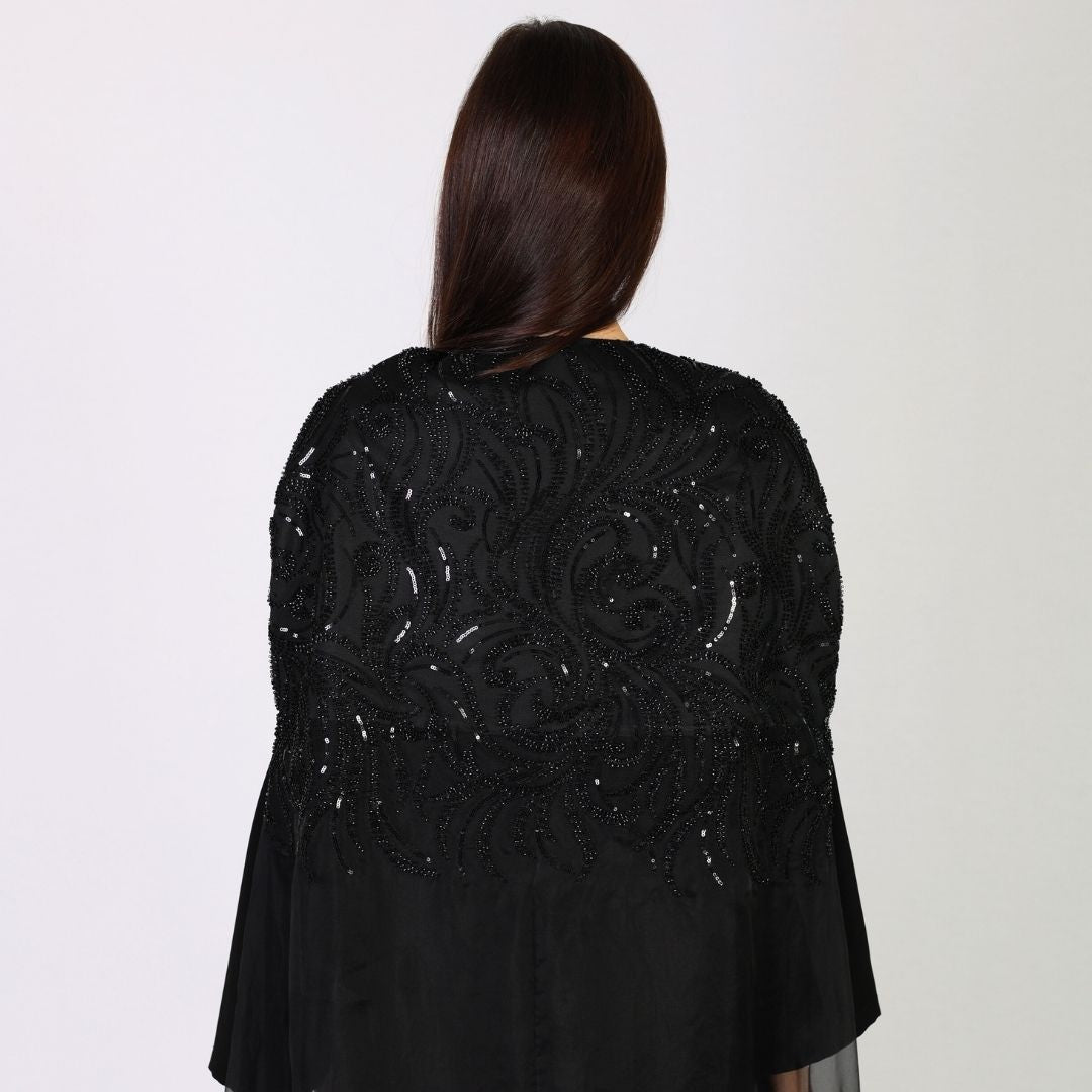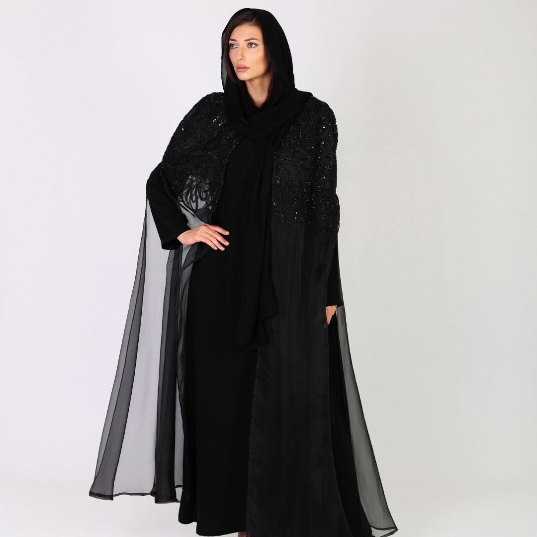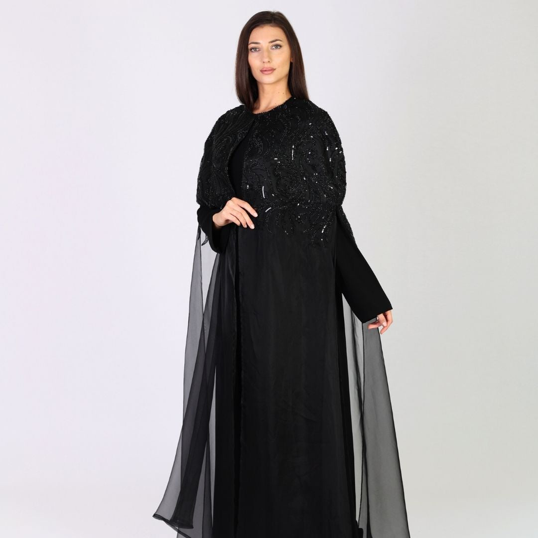 A sophisticated black abaya featuring a flowing sheer cape layer that adds graceful movement with every step. The upper bodice is adorned with delicate black sequins, creating a subtle shimmer without overpowering the design. Perfect for evening occasions, formal gatherings, or elevating your everyday modest style.