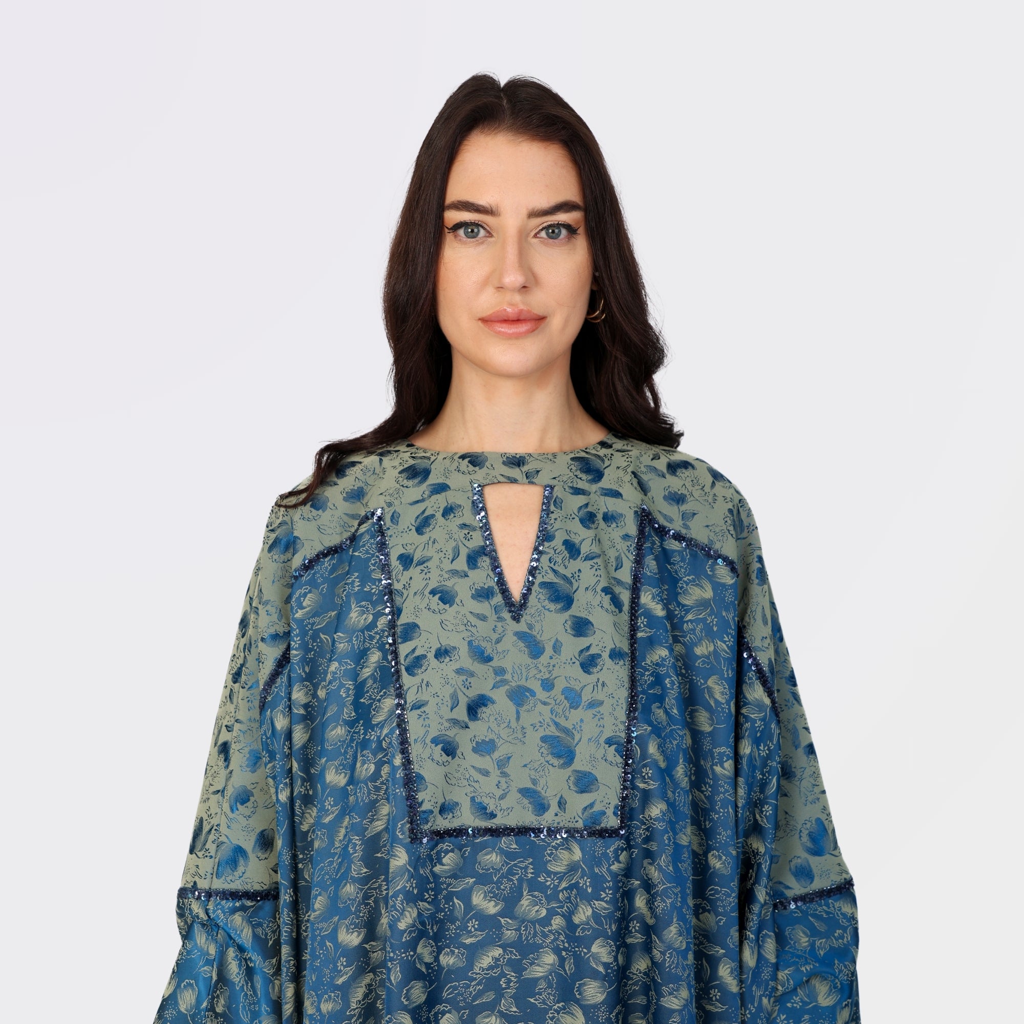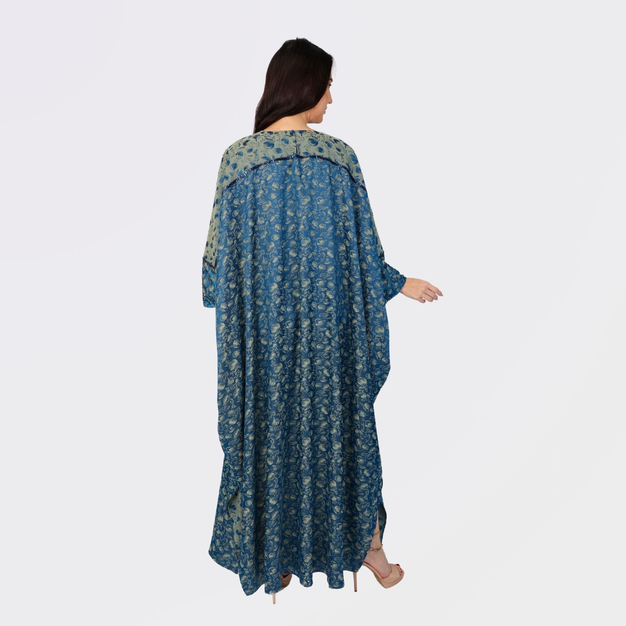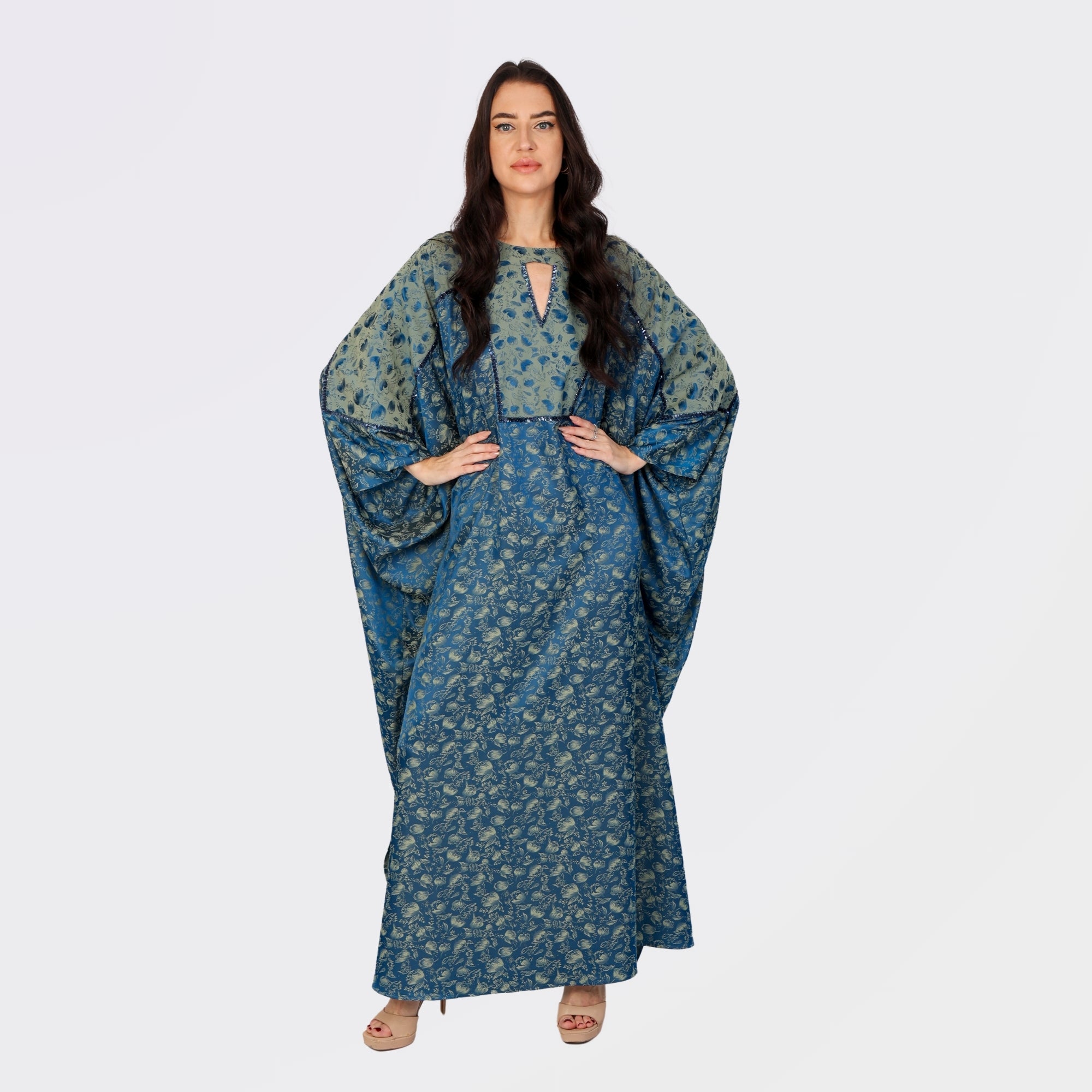 This stunning blue kaftan features a mix of rich green and navy floral patterns with shimmering sequin accents that highlight the neckline, cuffs, and sleeve panels. The elegant front keyhole cutout adds a modern touch to its traditional flowing silhouette, while the intricate detailing enhances its luxurious appeal. Perfect for evening gatherings or formal events, this kaftan effortlessly blends sophistication and comfort.