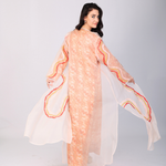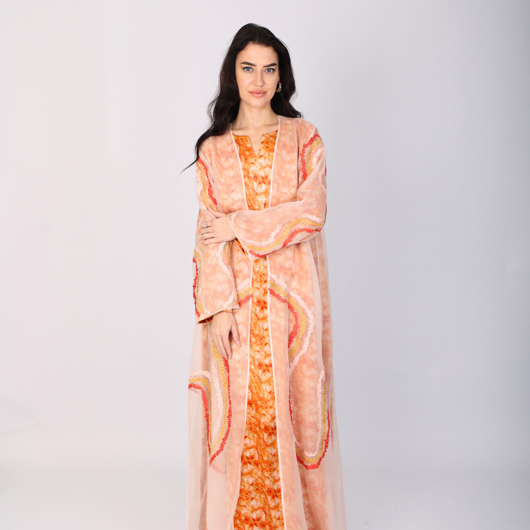Add a touch of grace to your wardrobe with this fuchsia printed Jalabiya with embroidered organza overlay, dress to make impression.