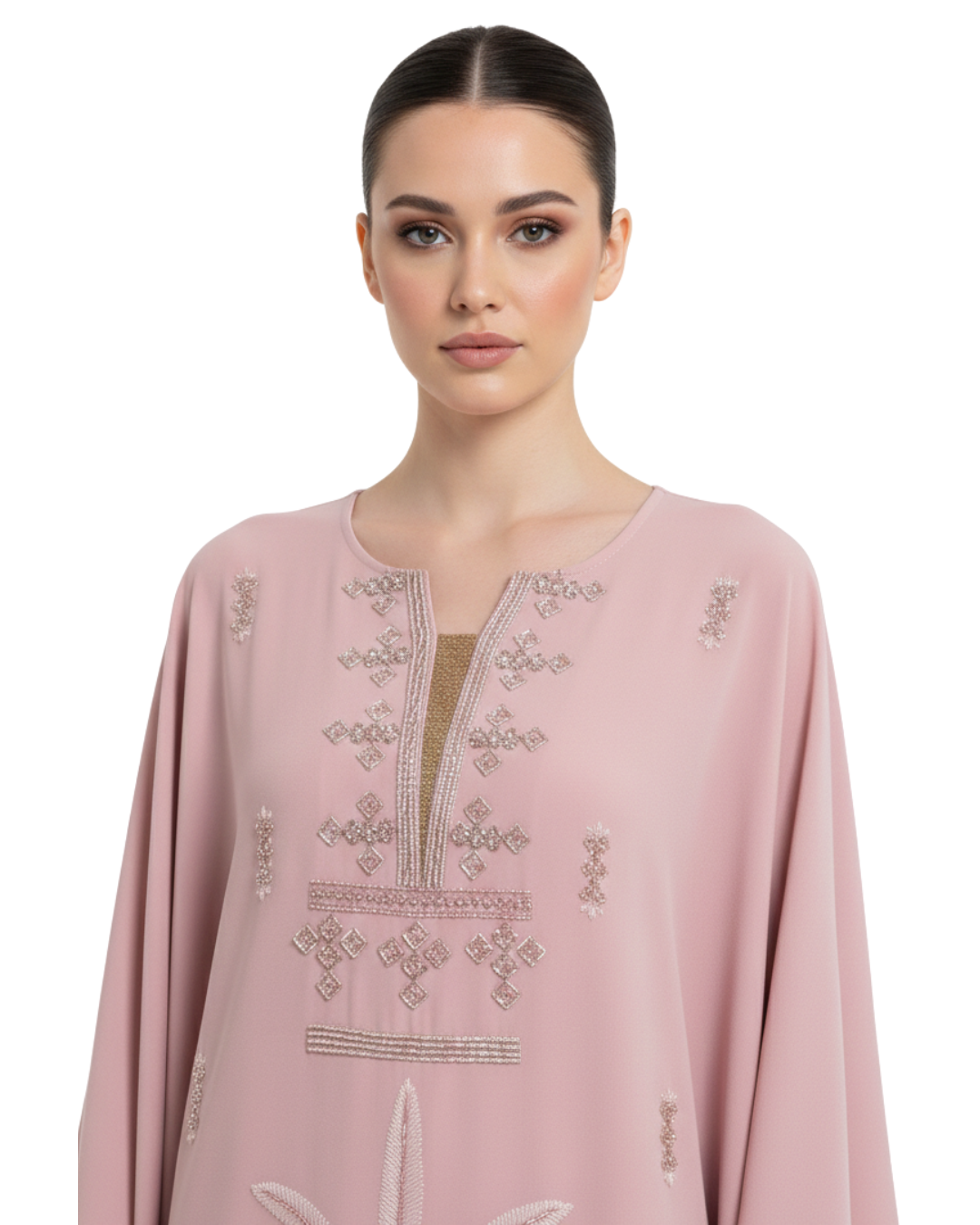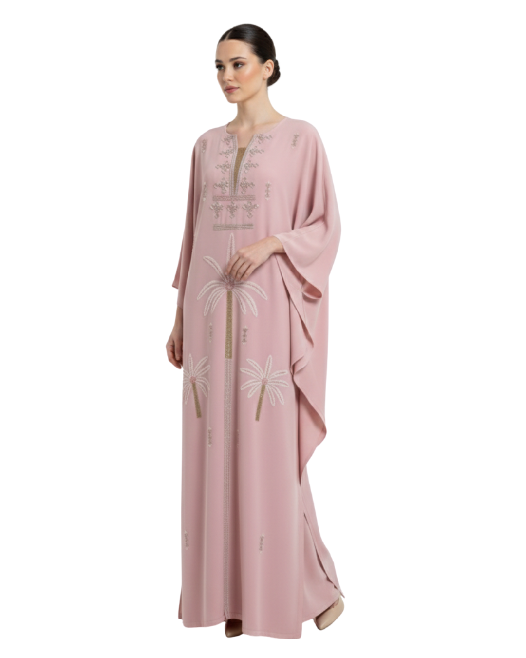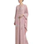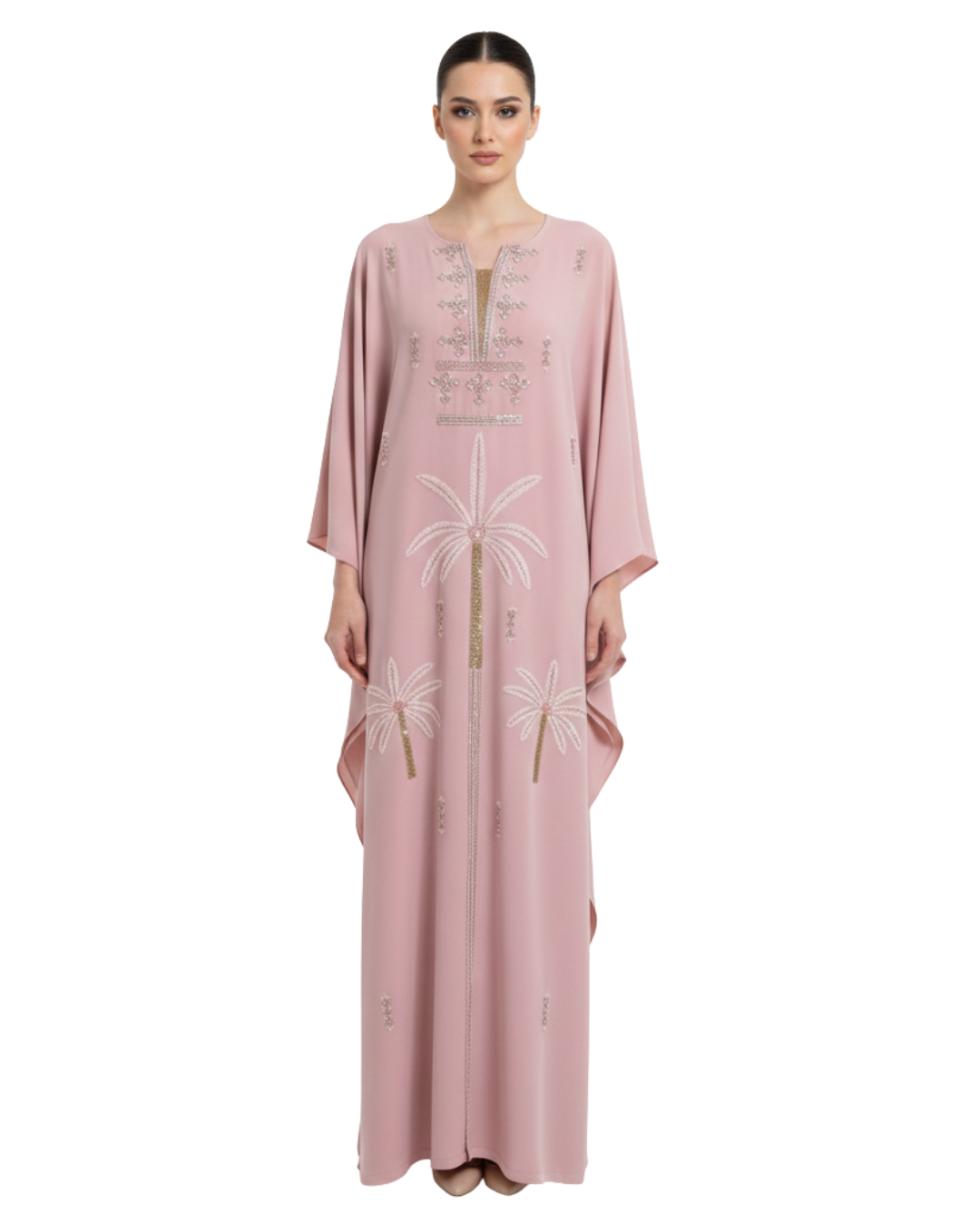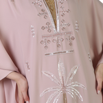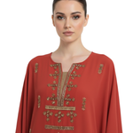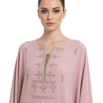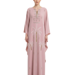 The kaftan’s minimalist neckline and wide sleeves enhance its timeless appeal, while the intricate embroidery adds a touch of understated luxury. Designed to move gracefully, this piece is both flattering and versatile.