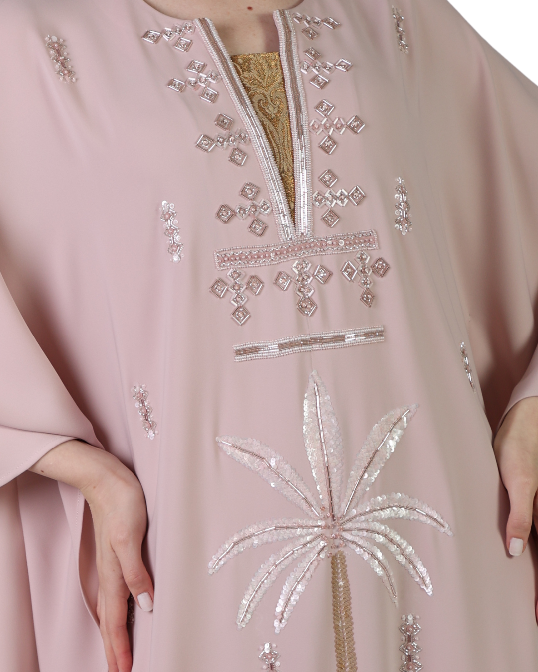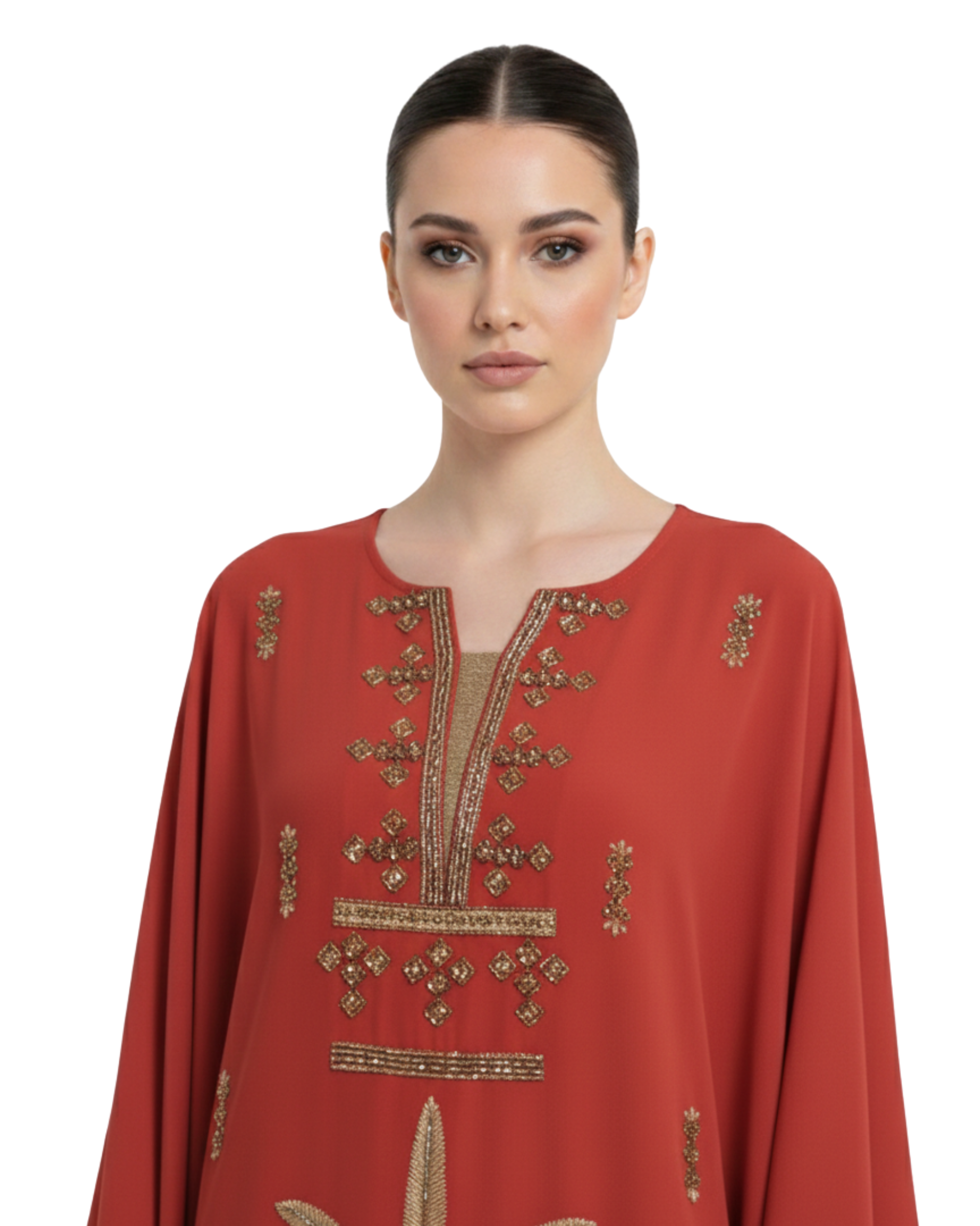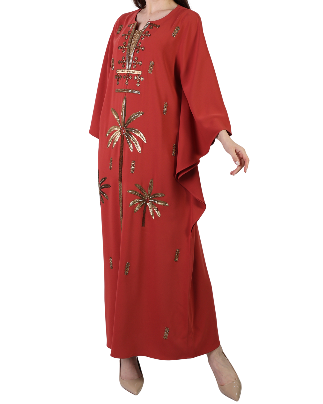 The kaftan’s minimalist neckline and wide sleeves enhance its timeless appeal, while the intricate embroidery adds a touch of understated luxury. Designed to move gracefully, this piece is both flattering and versatile.