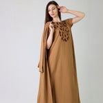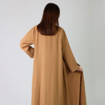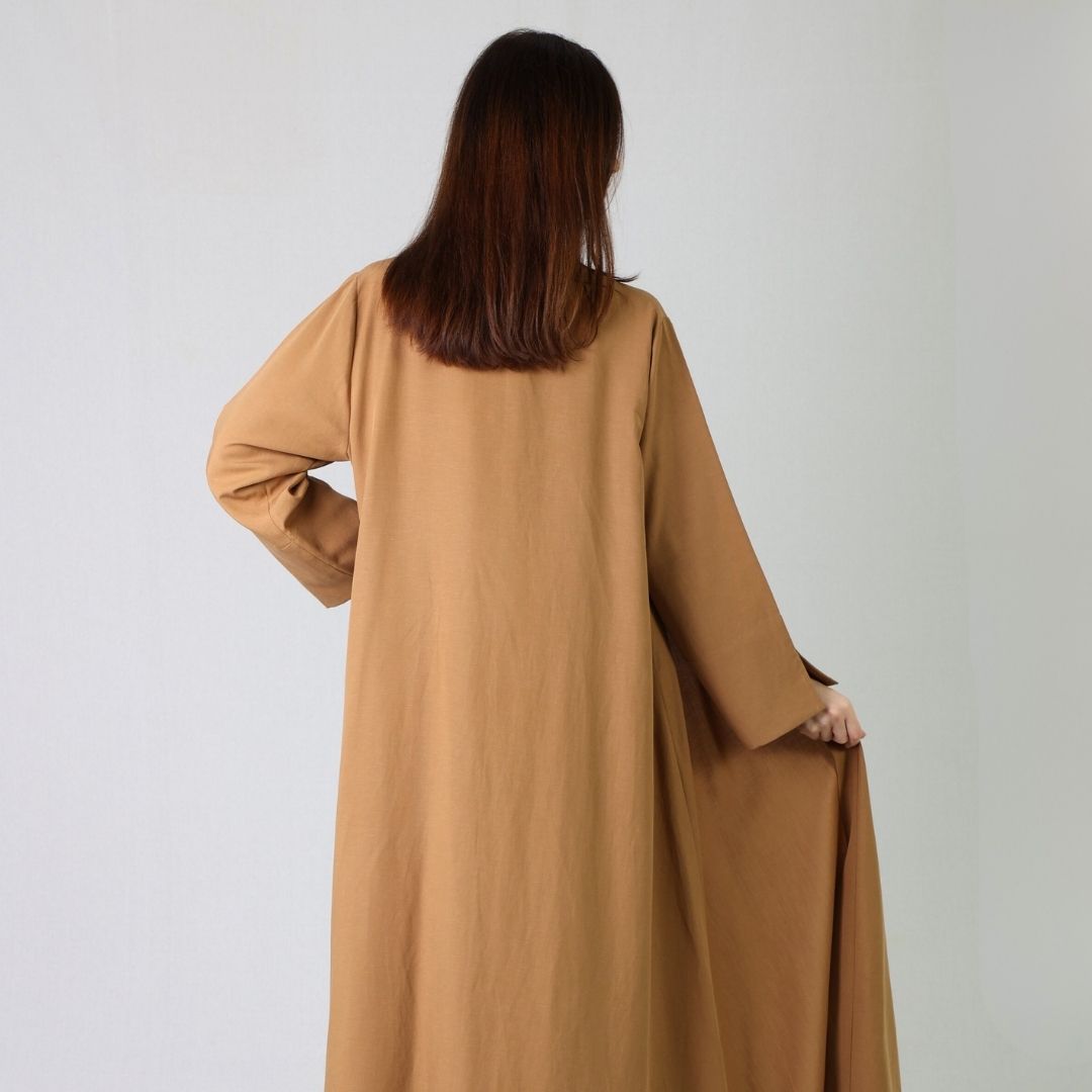 Sandy brown linen abaya set featuring an inner with cape sleeves and pockets, adorned with delicate thread work on the front. Paired with a tone-on-tone linen abaya and matching shyla for a refined, elegant finish.
