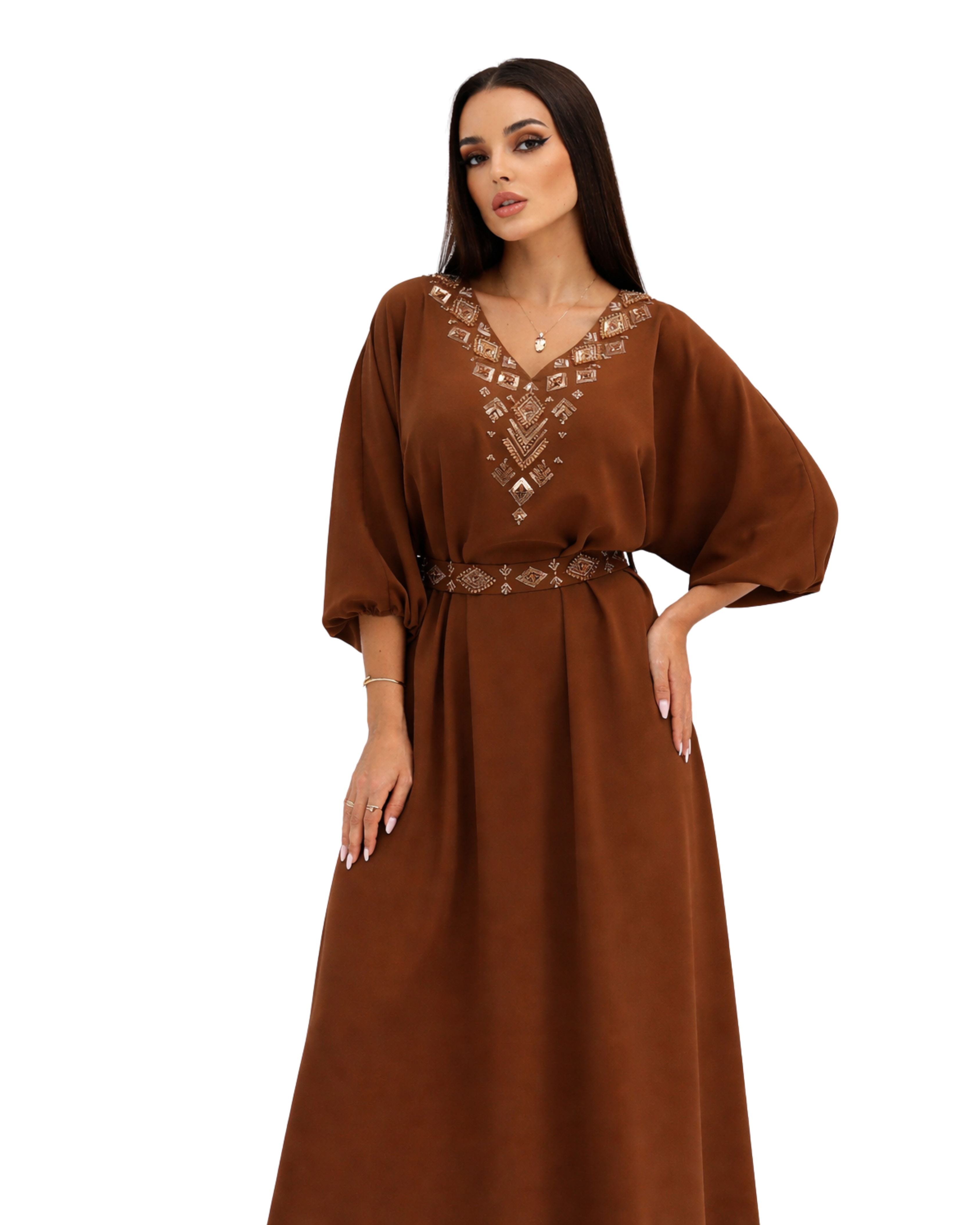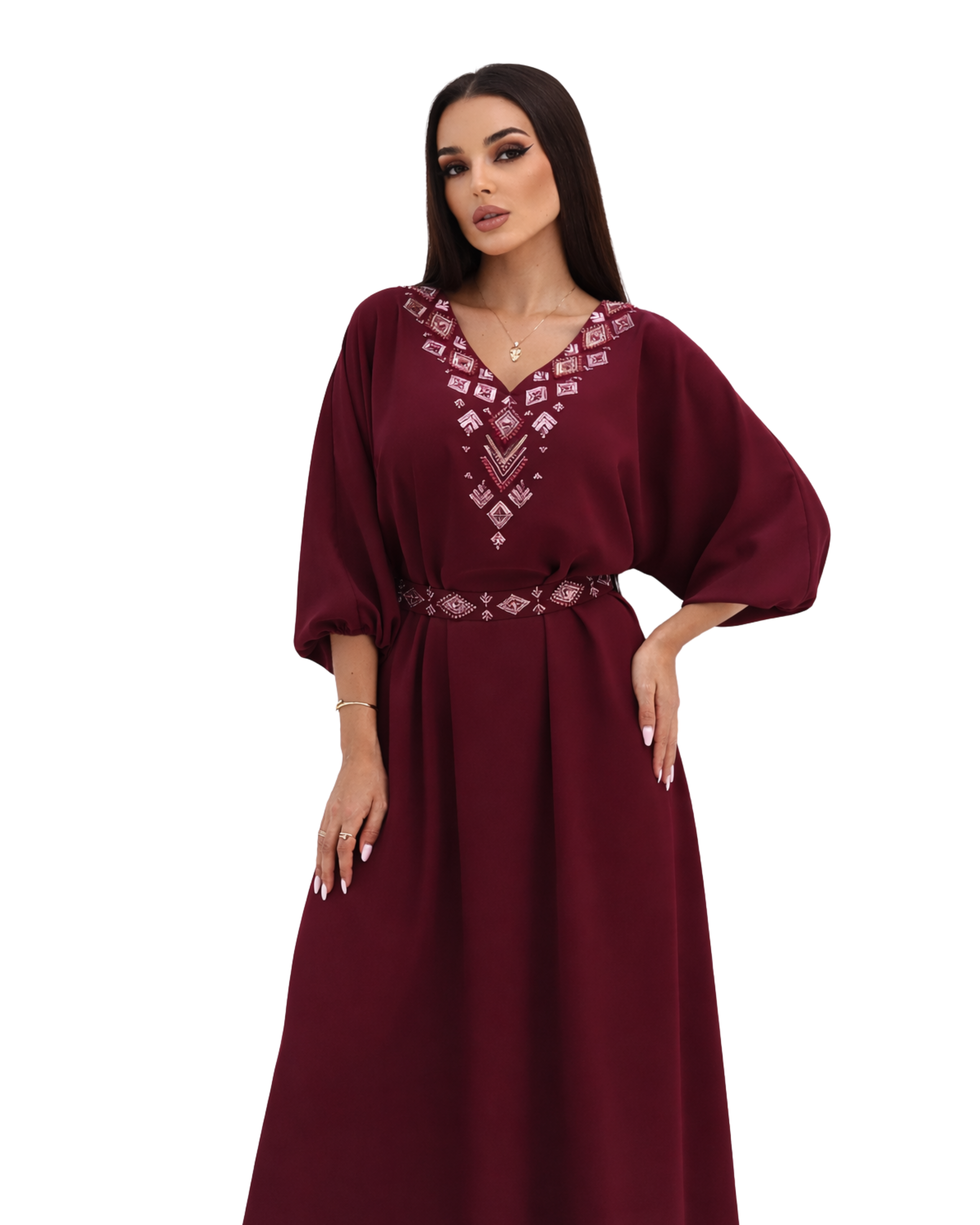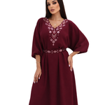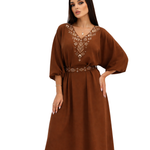 Feel effortlessly chic in this beautifully designed salmon dress with embroidered neck and belt, perfect for going out for the night post eid celebrations.
