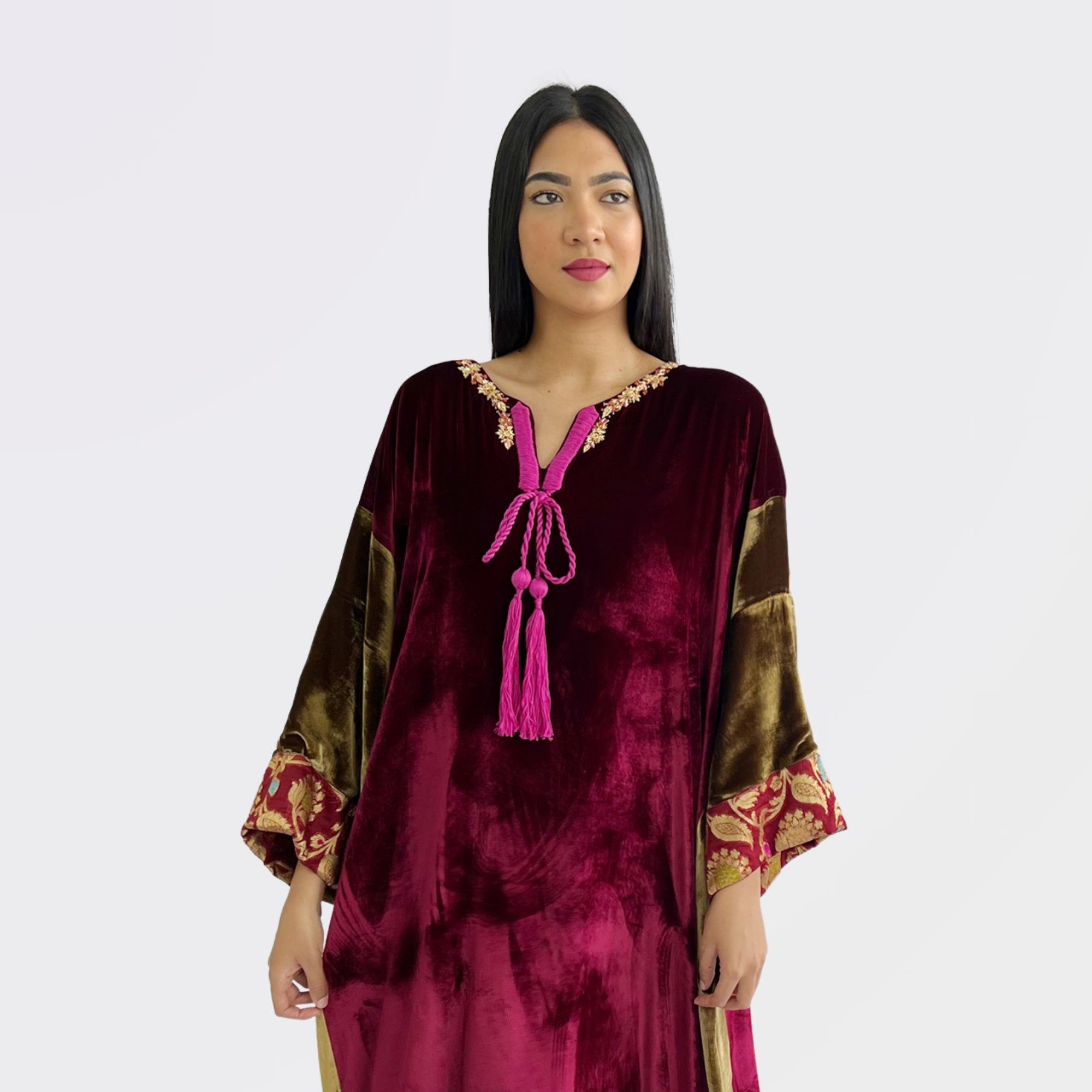 This kaftan's exquisite rich burgundy velvet is accentuated with delicate beaded around the neckline and nakshi embroidery, which adds a subtle yet eye-catching adornment. A striking cotton tassel in a fuchsia hue ties around the neckline, creating a lively and fun element. The Banaras fabric cuffs on the broad sleeves, which have classic designs, and the Banaras trim around the hemline and side slits give the dress a sophisticated, well-coordinated appearance. The overall silhouette is regal and flowing, representing a fusion of elegance from the past and present.