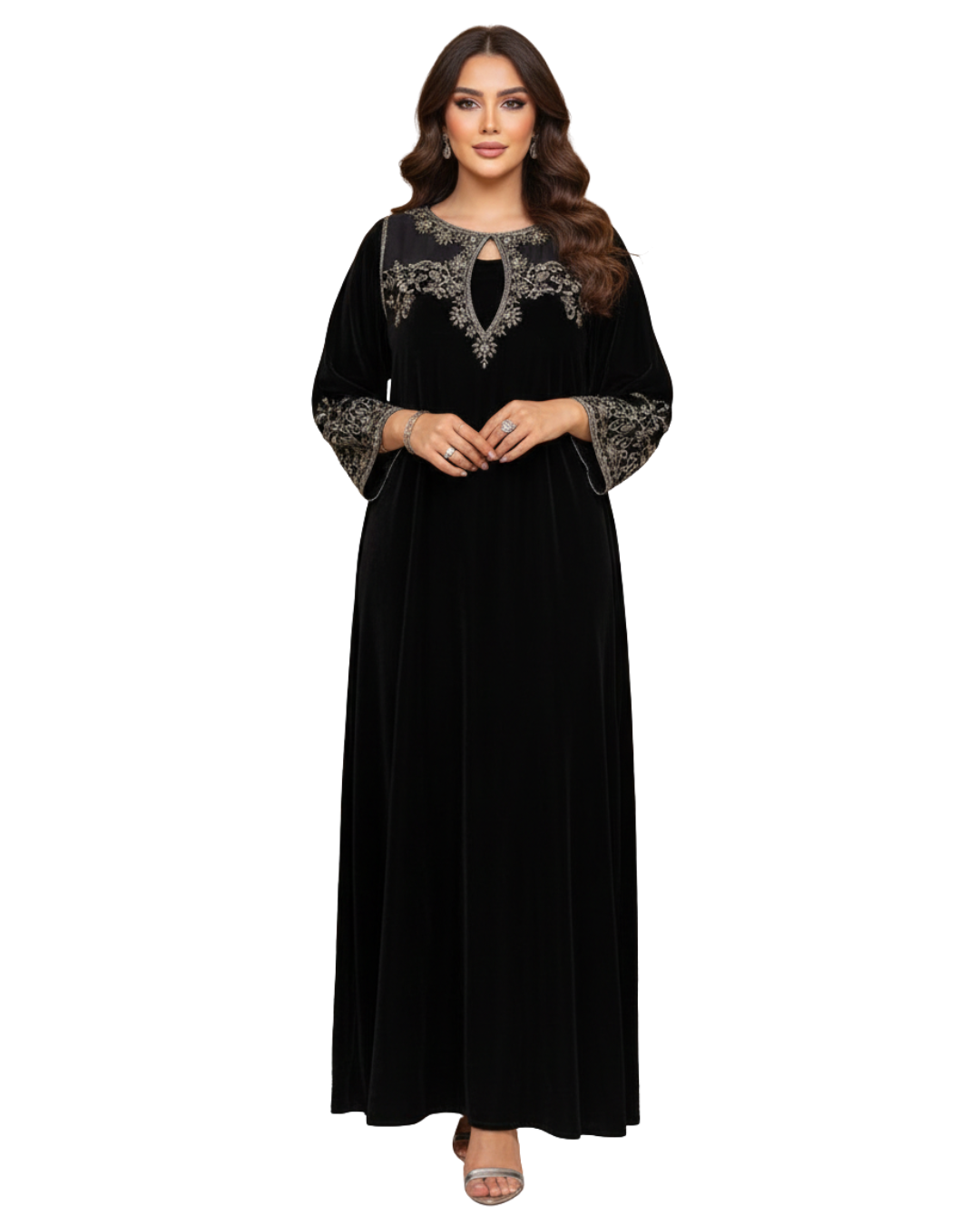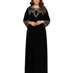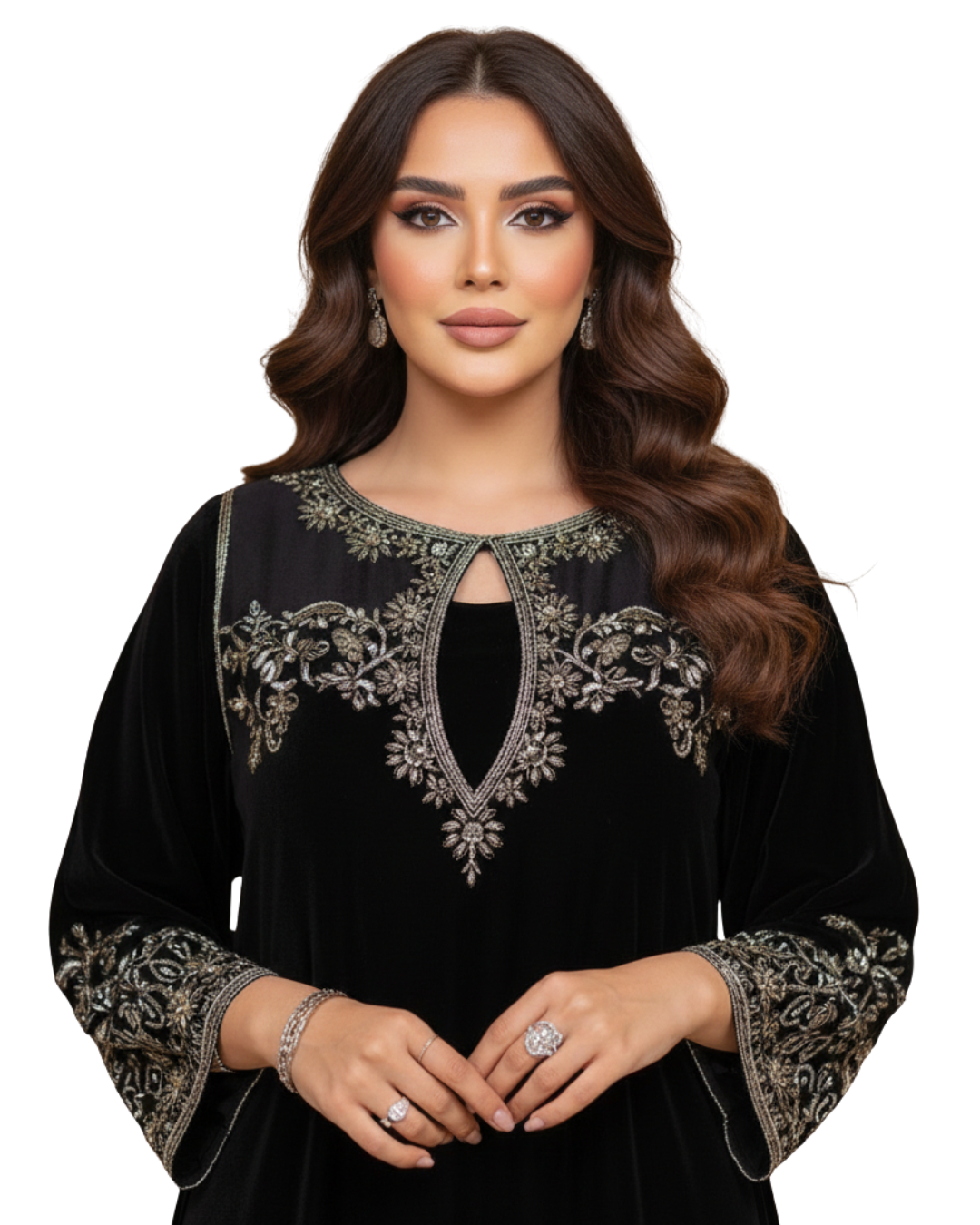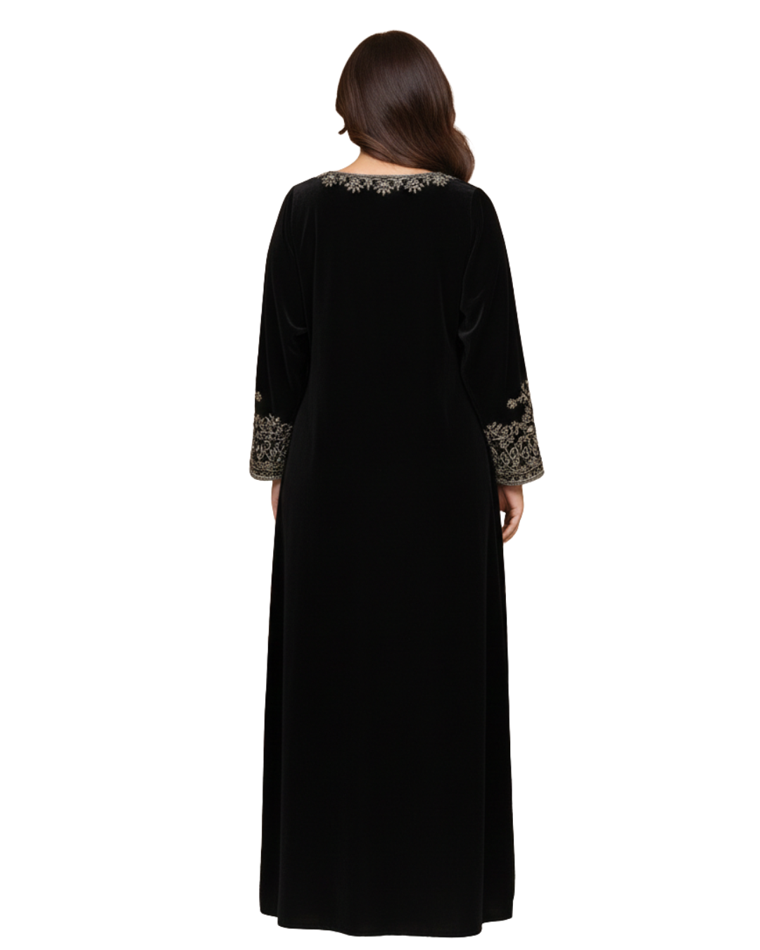 Make a timeless statement with Layali, a luxurious black velvet jalabiya designed for refined elegance. Crafted in rich velvet, this piece features intricate gold embroidery along the neckline and cuffs, adding a touch of traditional charm with a sophisticated modern finish.