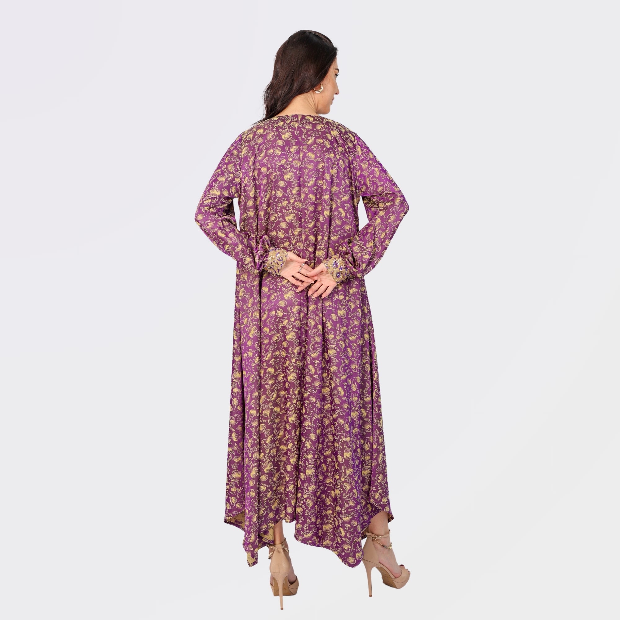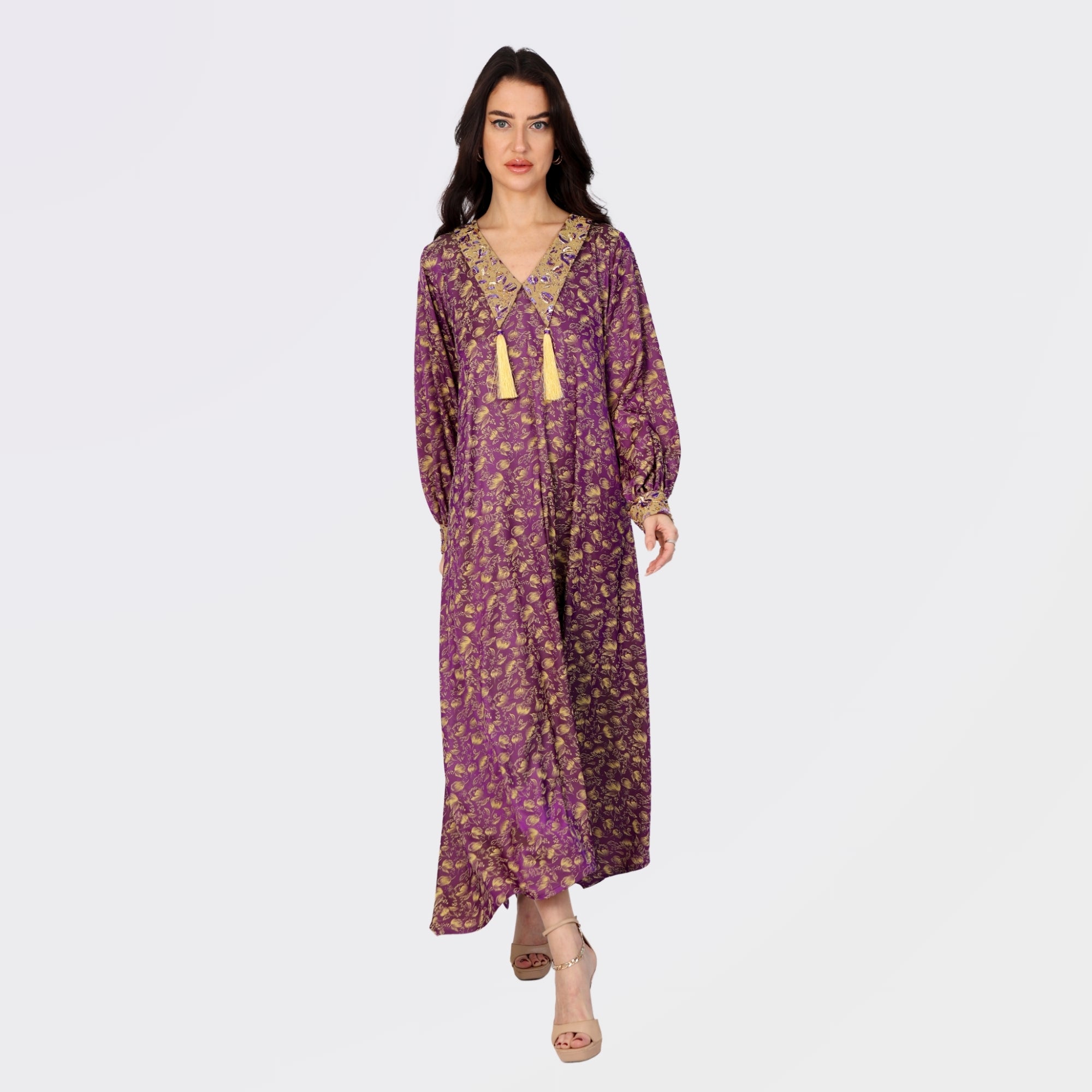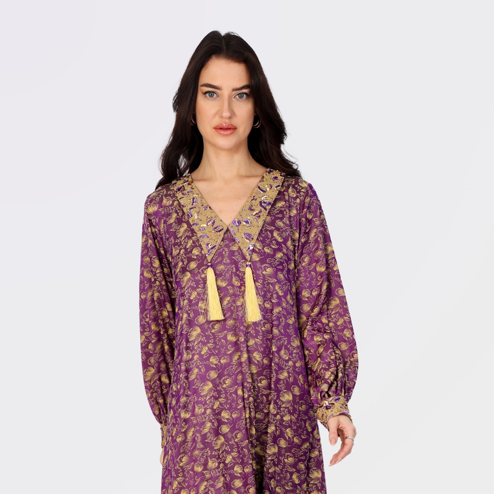 Elegant purple kaftan with golden floral patterns, featuring intricate embroidered details on the neckline and cuffs. Accented with playful tassels and a flowing silhouette, perfect for formal or festive occasions.