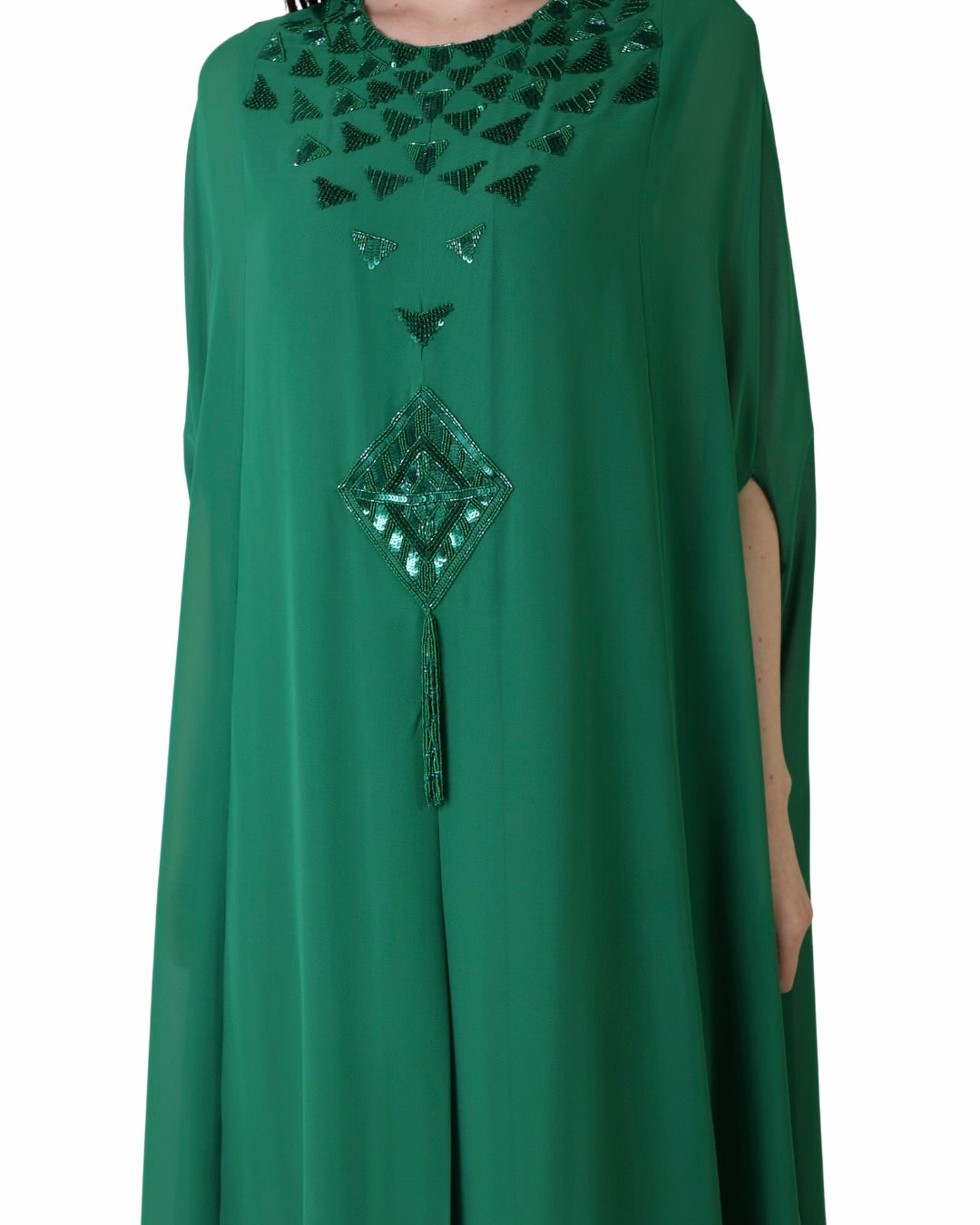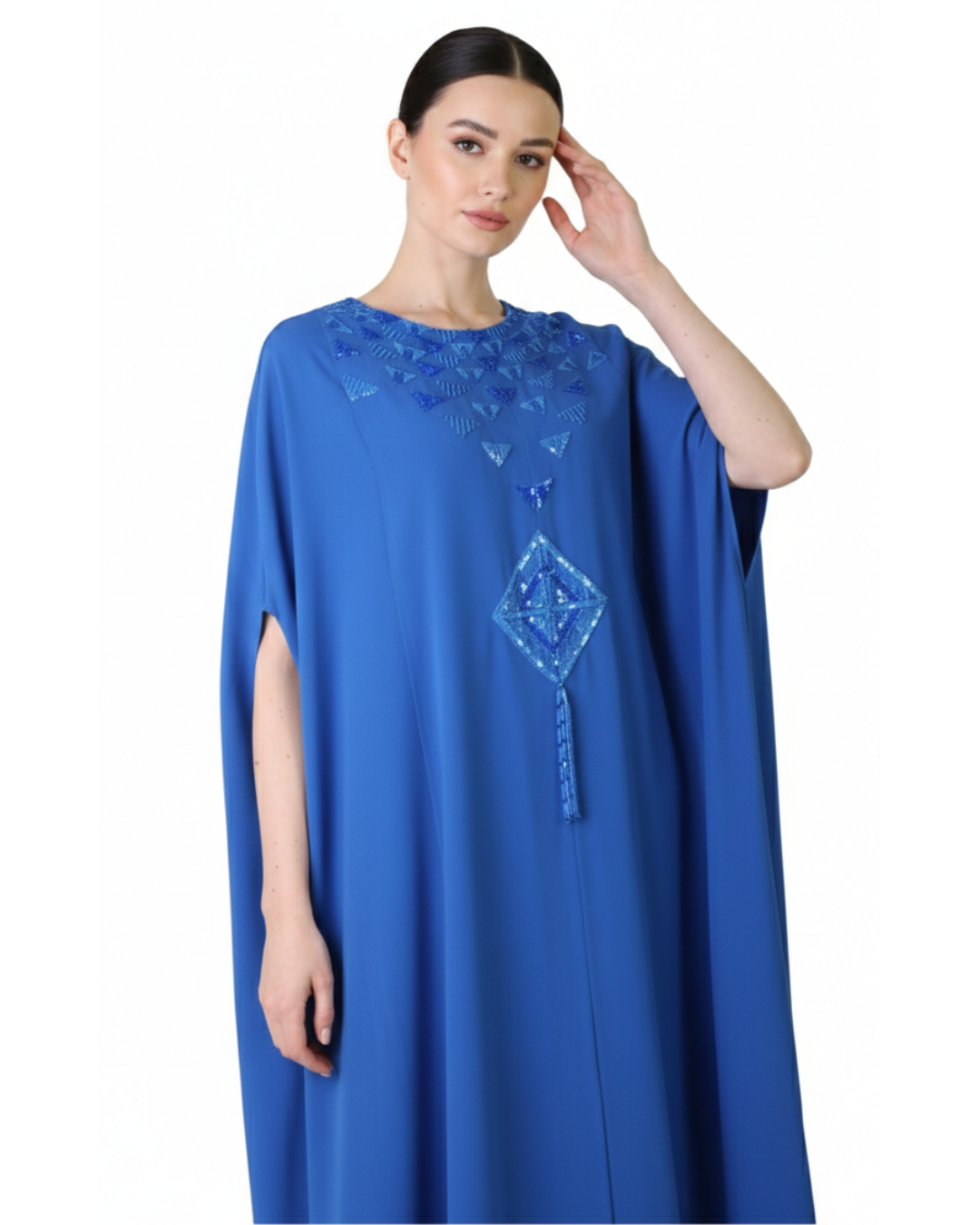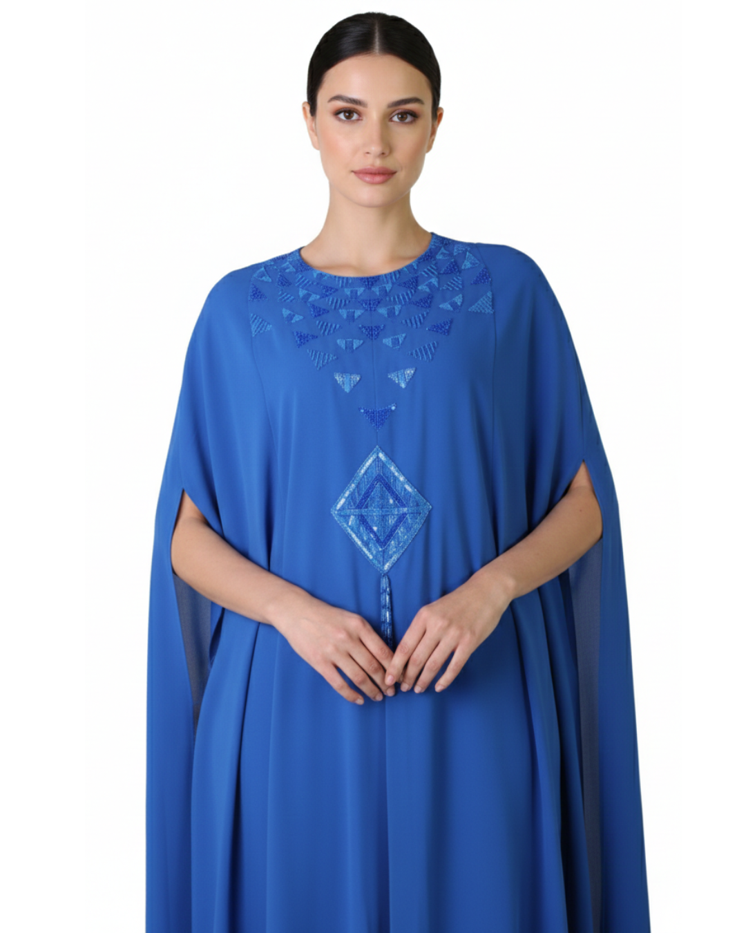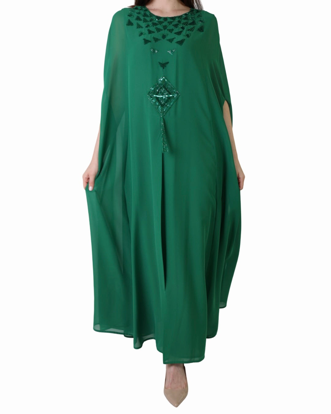 Elegant chiffon kaftan featuring delicate geometric embroidery and a soft, flowing silhouette—perfect for graceful, refined occasions.