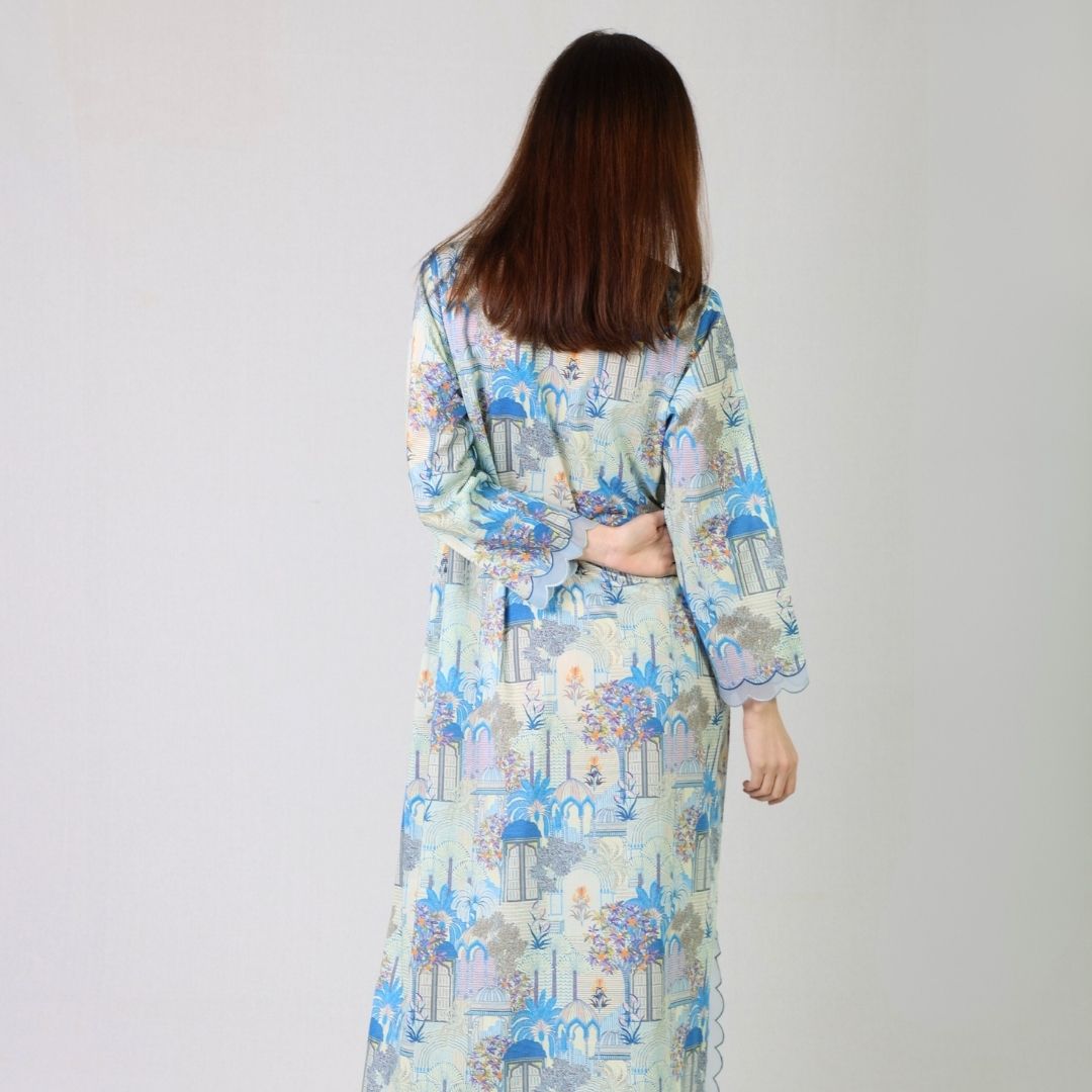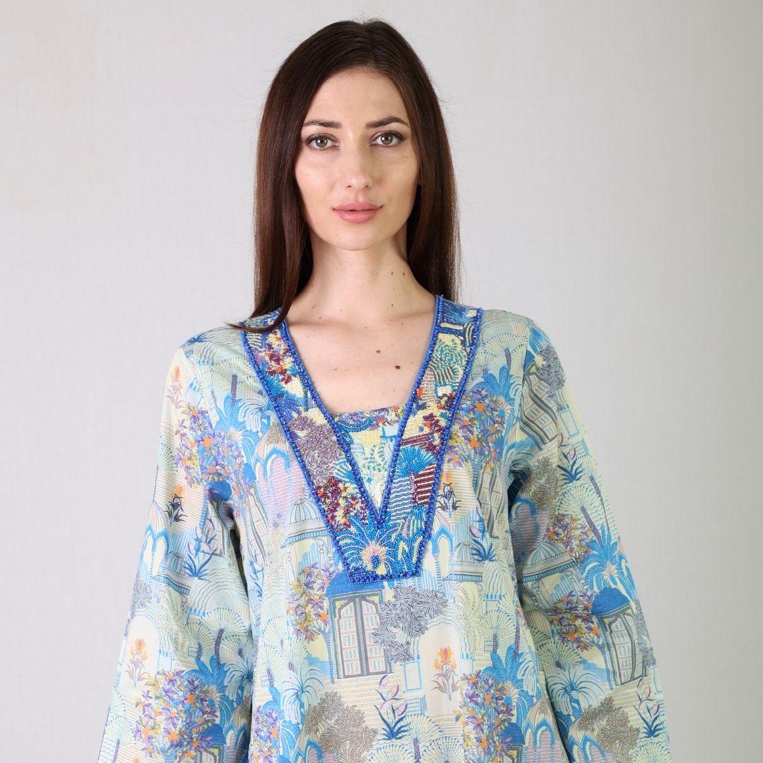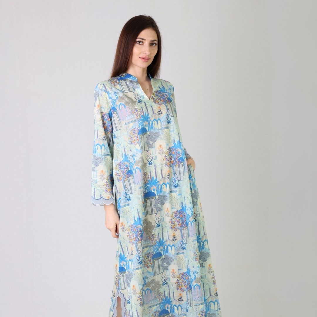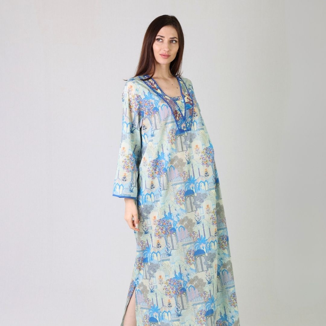 Crafted from Cotton, this floral jalabiya features intricate embroidery on the neckline and elegant V-cut sleeve detailing for a modern touch.